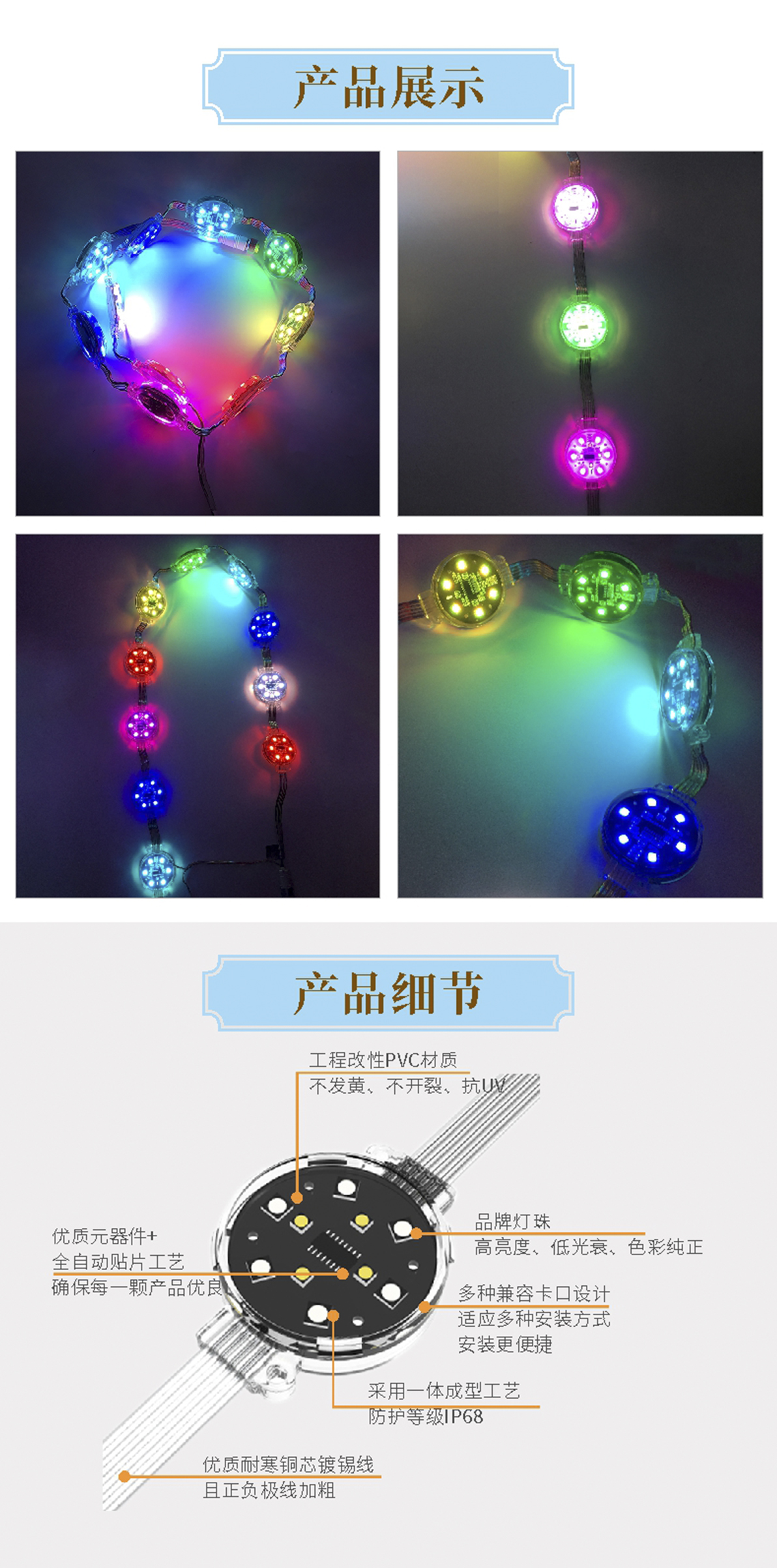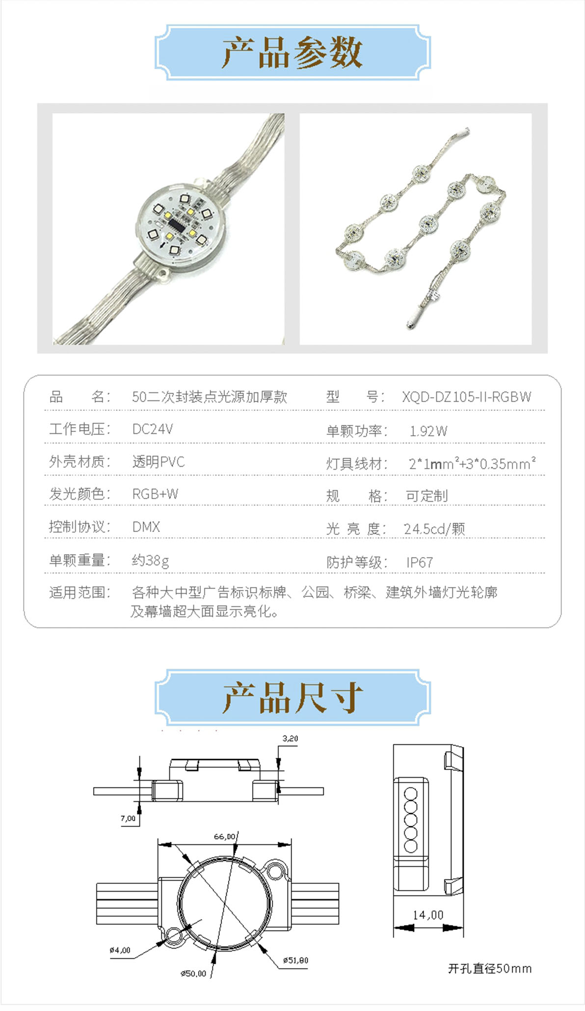 產(chǎn)品用途: 1.采用一體成型工藝,防護等級高; 2.加厚型優(yōu)質(zhì)阻然膠料,抗 UV、抗鹽霧、耐沖擊; 3.適應多種安裝方式,安裝簡單可靠; 4.優(yōu)質(zhì)進口燈珠,亮度高、色彩純正,穩(wěn)定性好; 5.該產(chǎn)品為較大型的 LED 點光源,亮度較高;適用于大型建筑物的景 觀照明及大型橋梁輪廓勾勒。 安裝方式:1.卡鋁槽 2.裝鋼絲卡扣 3.打孔安裝 4.打螺絲固定