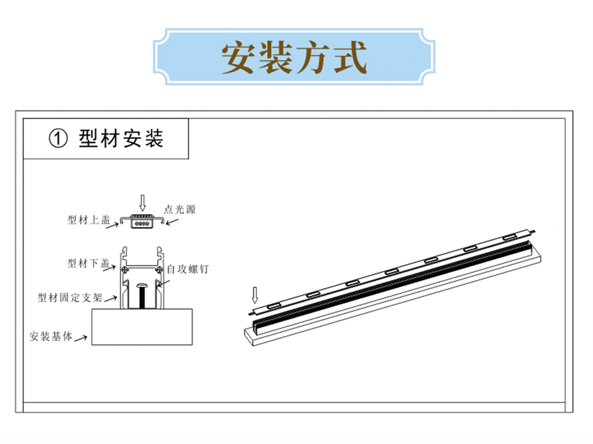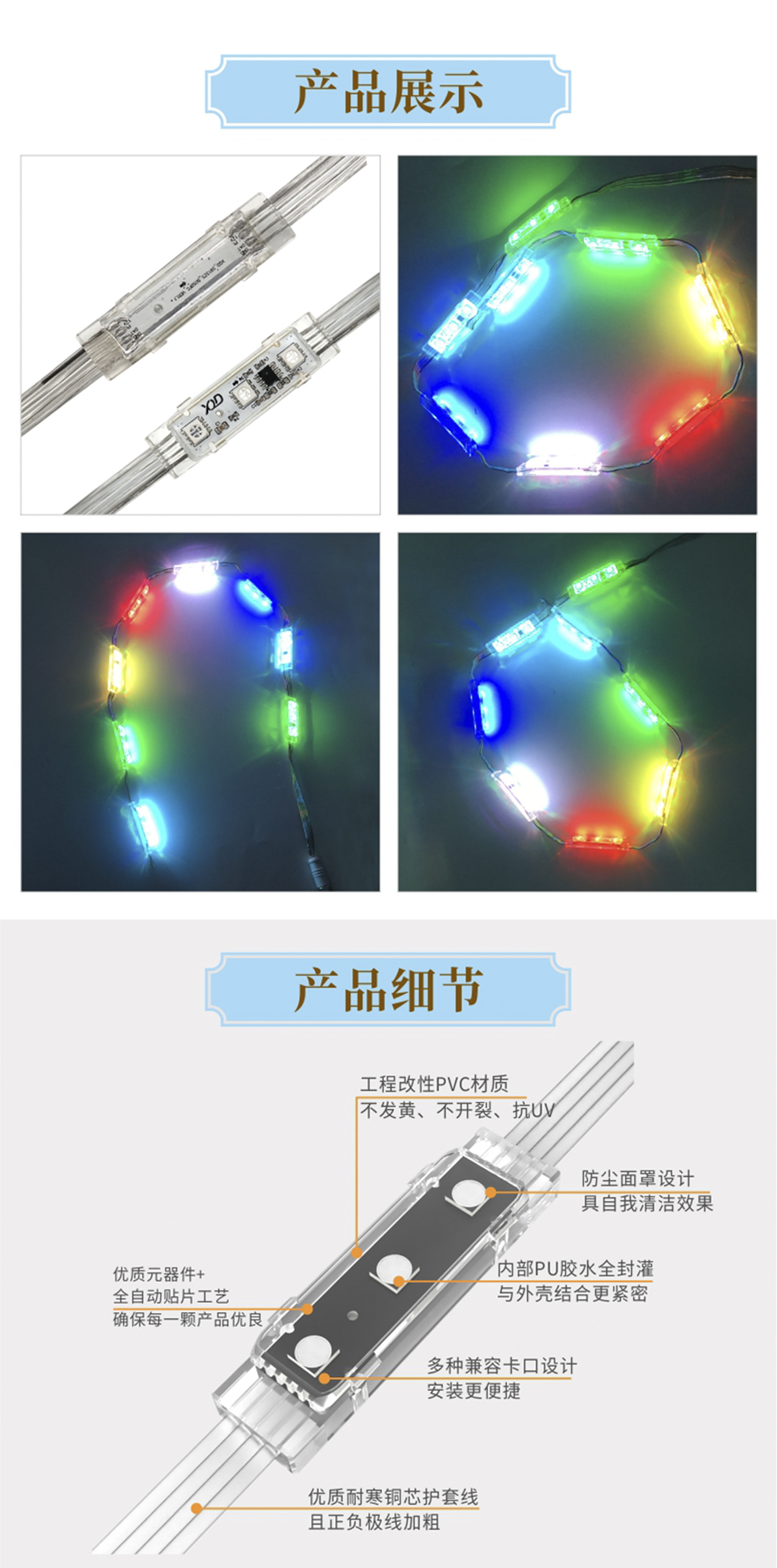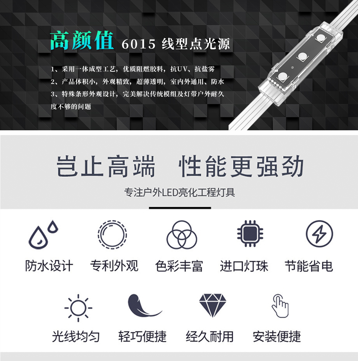 產(chǎn)品用途: 1.采用一體成型工藝,防護(hù)等級(jí)高; 2.產(chǎn)品體積小,外觀精致,超薄透明,室內(nèi)外通用; 3.優(yōu)質(zhì)阻然膠料,抗UV、抗鹽霧; 4.特殊條形外觀設(shè)計(jì),完美解決傳統(tǒng)模組及燈帶戶外耐久度 不夠的問(wèn)題 安裝方式: 1.卡鋁槽 2.打孔安裝