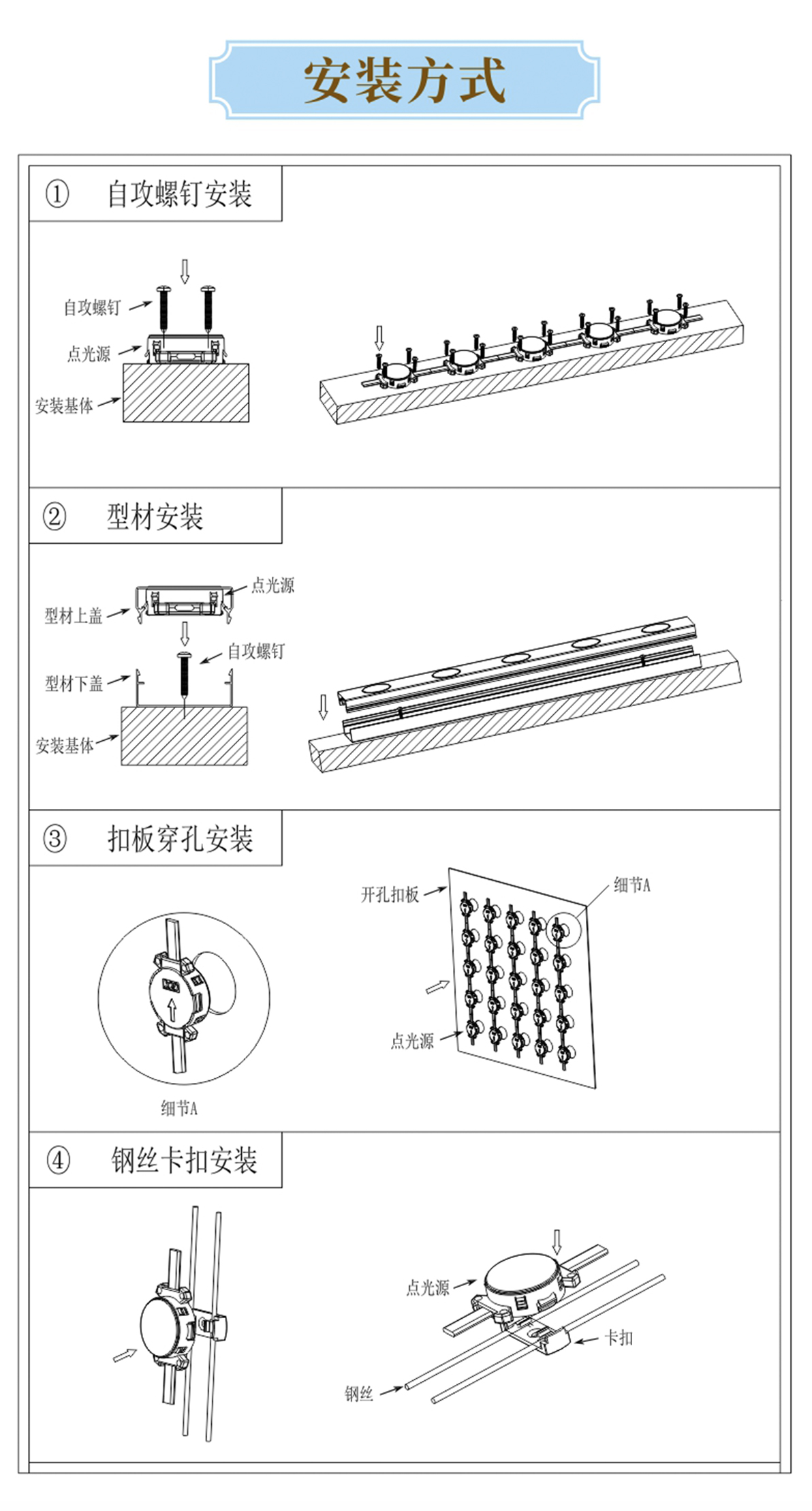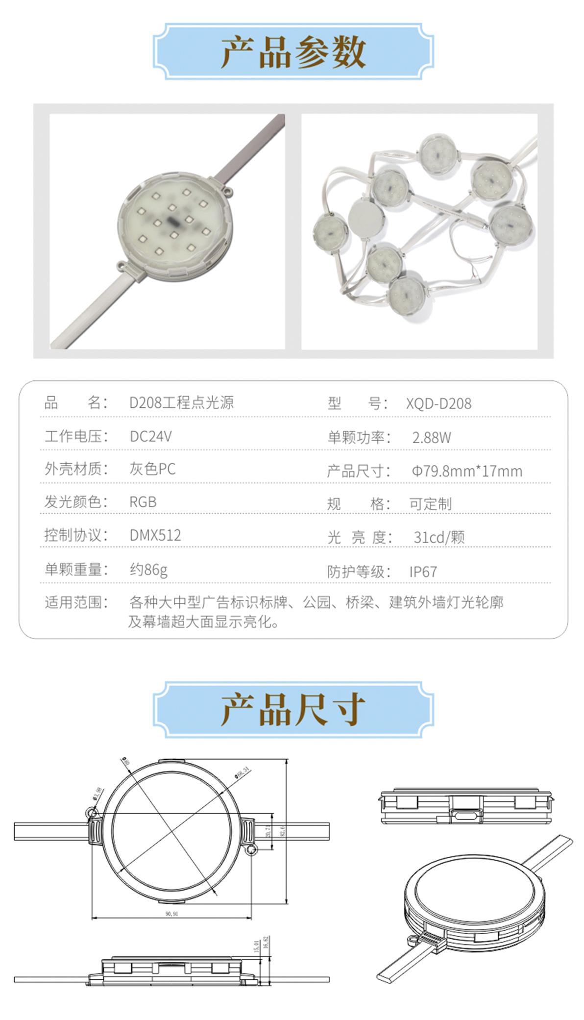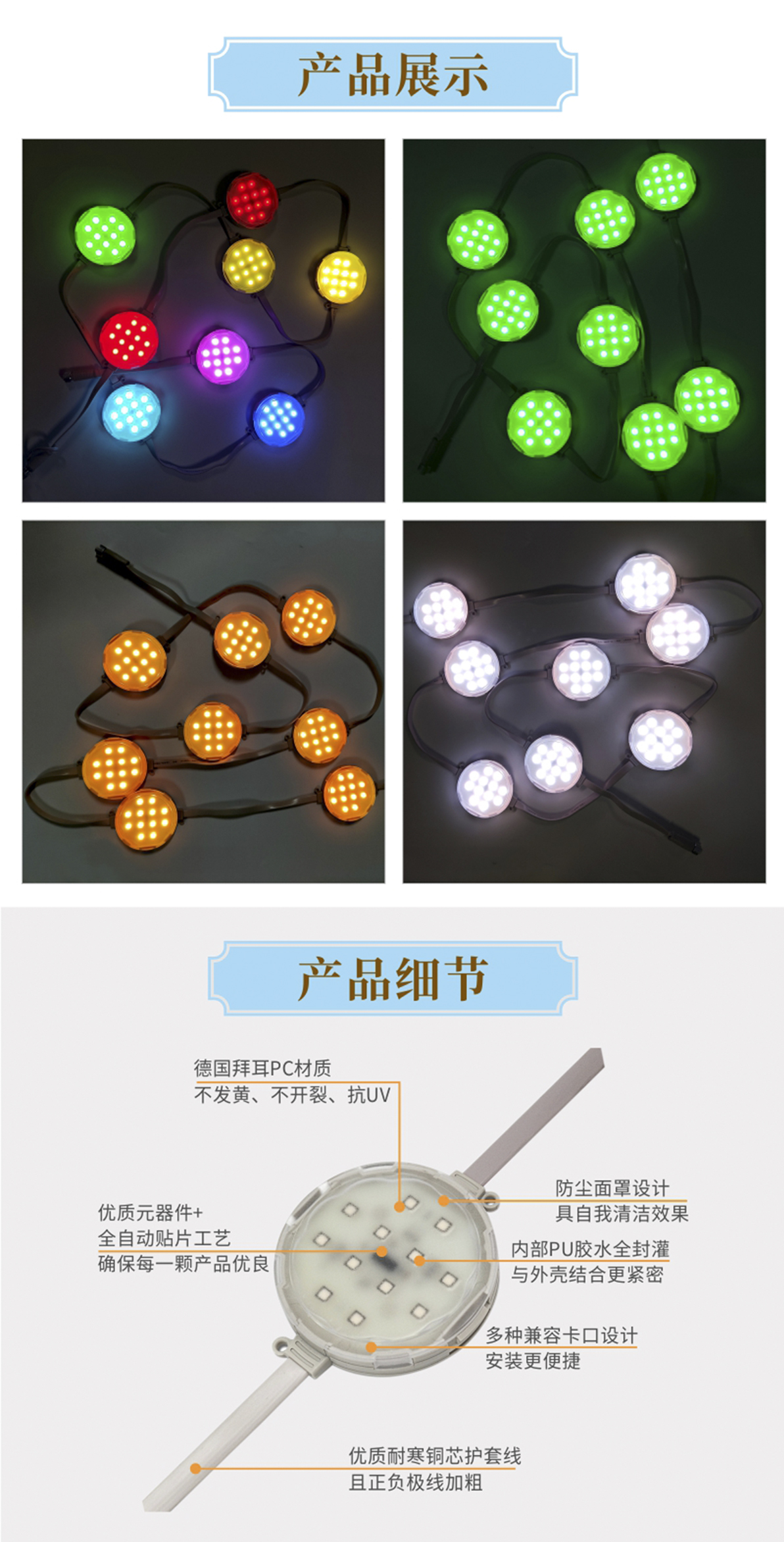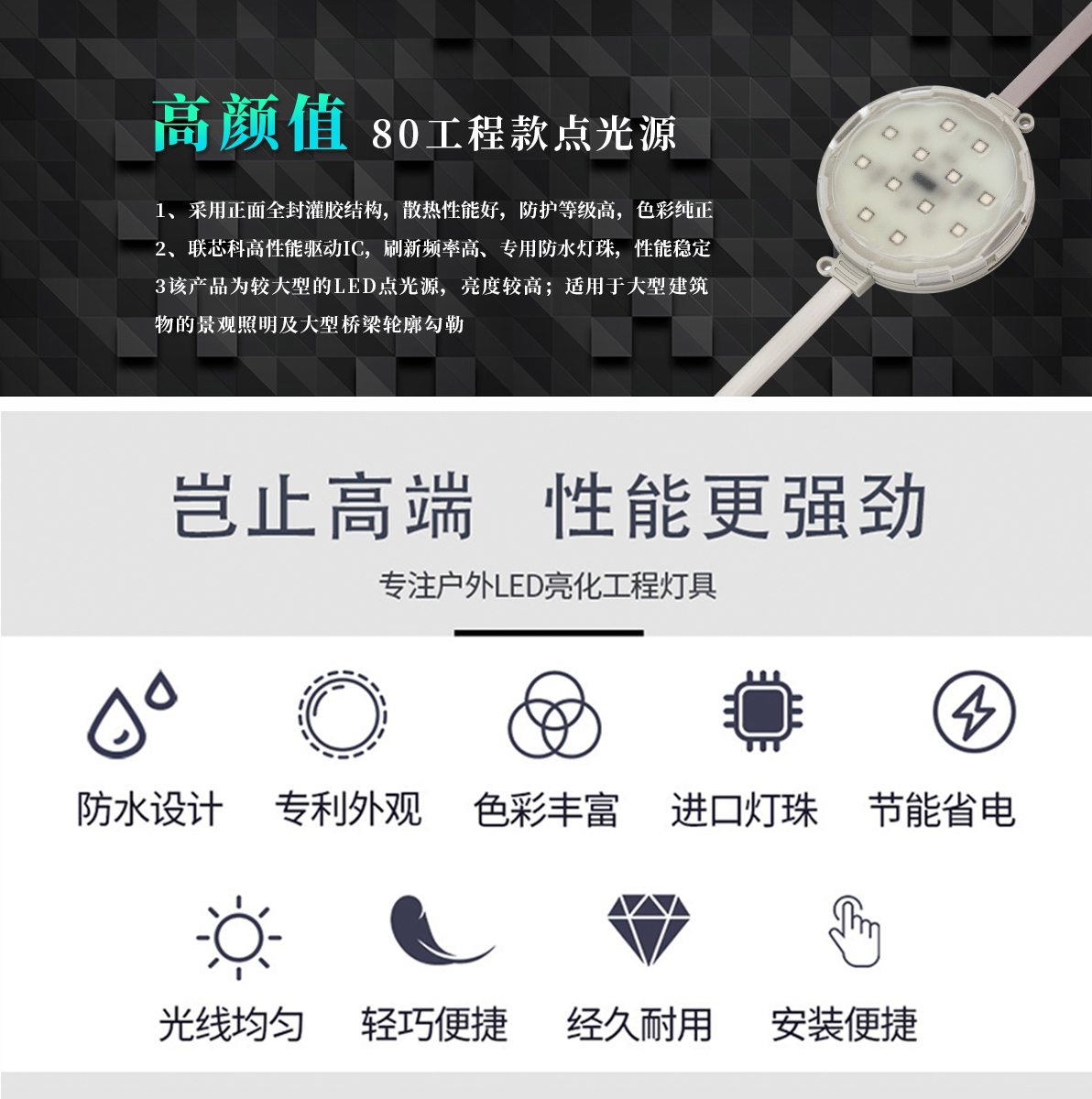 產(chǎn)品用途: 1.采用正面全封灌膠結(jié)構(gòu),散熱性能好,防護(hù)等級高; 2.采用戶外專用防水燈珠,色彩純正,性能穩(wěn)定; 3.搭載明微、聯(lián)芯科高性能驅(qū)動 IC,刷新頻率高,色彩表現(xiàn)好; 4.該產(chǎn)品為較大型的 LED 點光源,亮度較高; 適用于大型建筑物的景觀照明及大型橋梁輪廓勾勒。 安裝方式: 1.卡鋁槽 2.裝鋼絲卡扣 3.打孔安裝. 4 螺絲固定