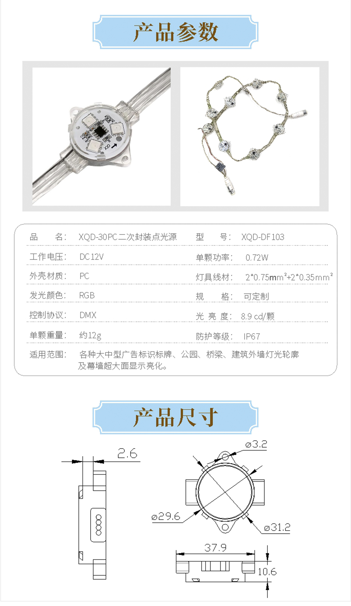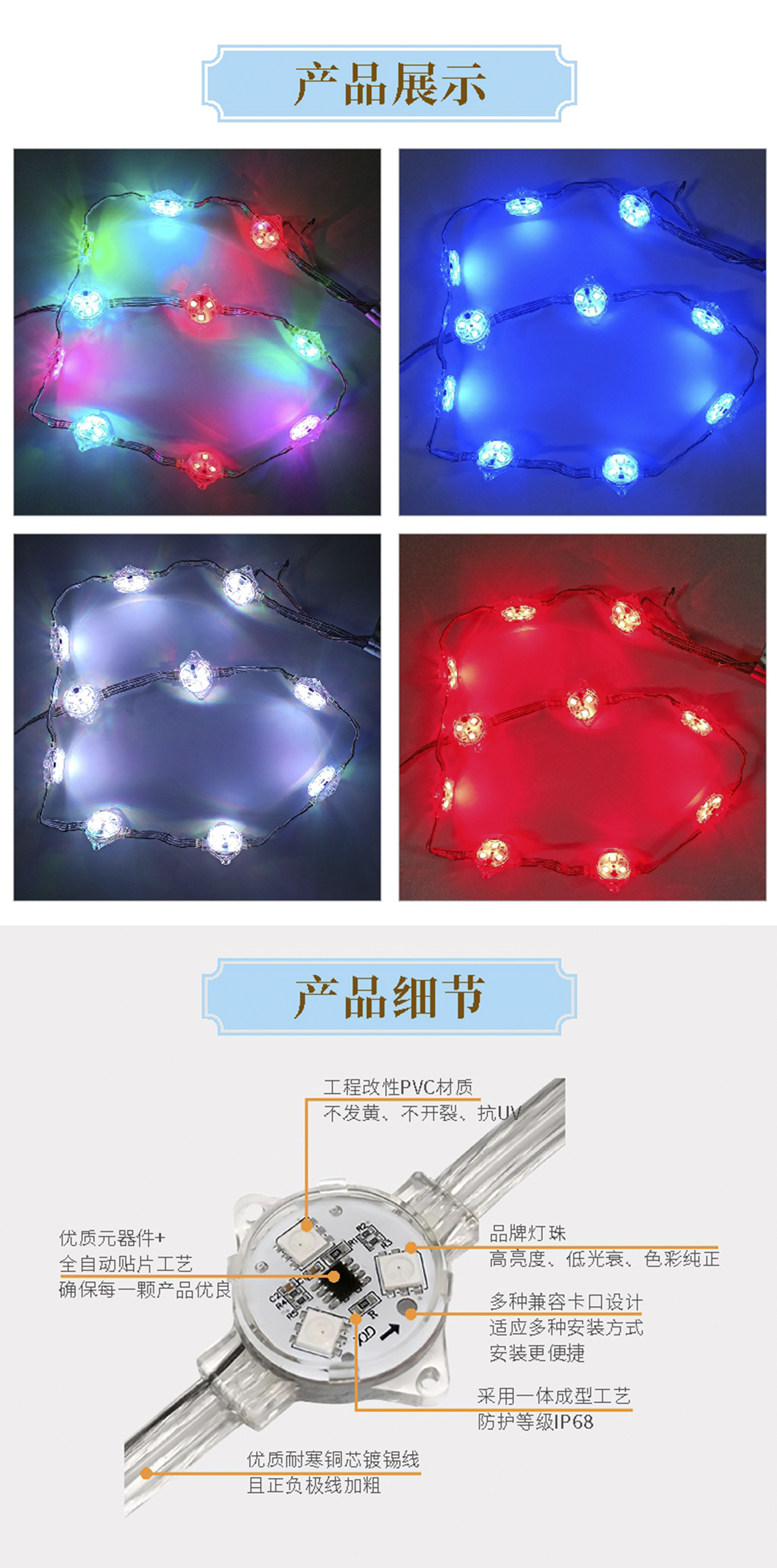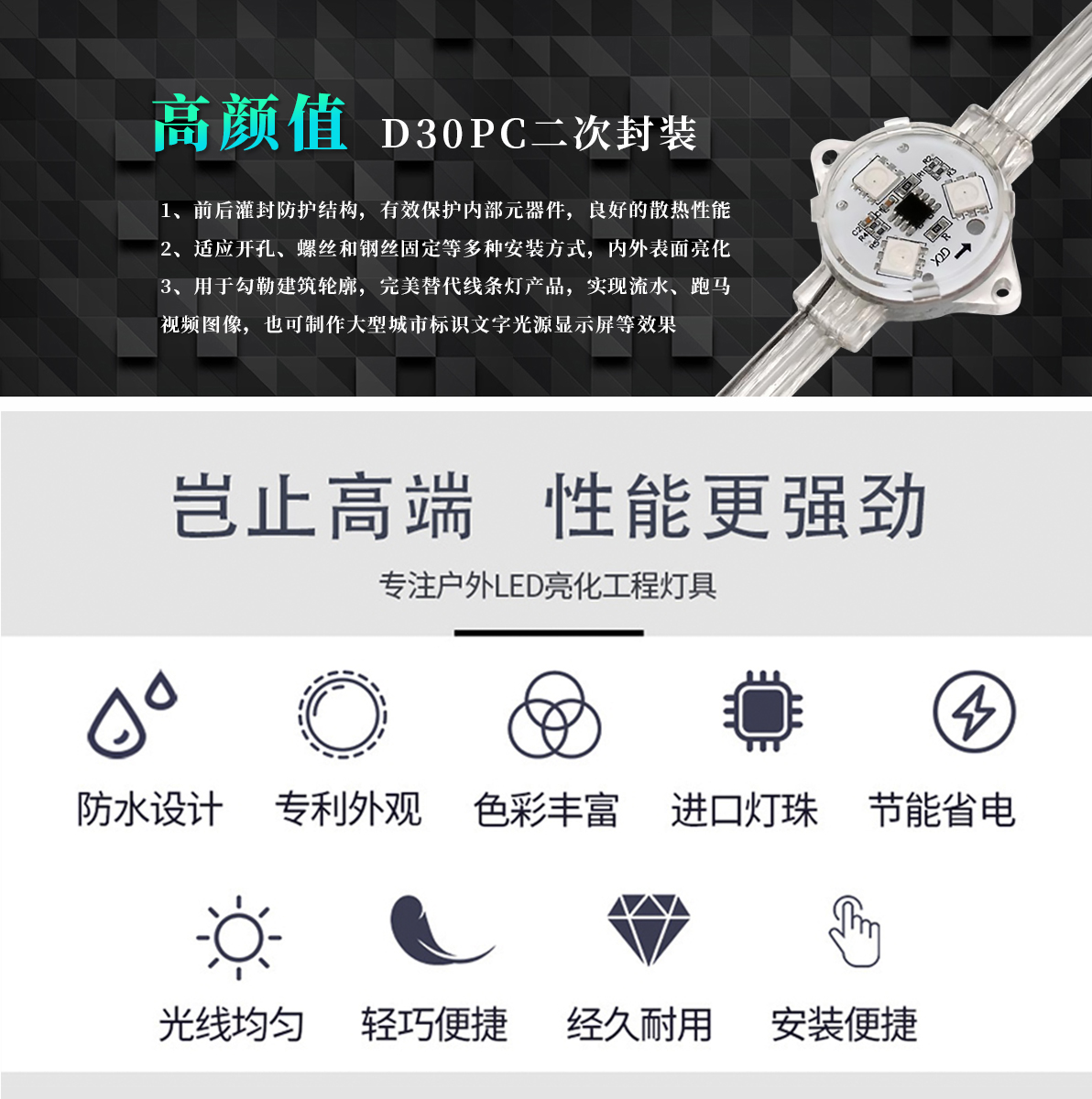 產品特點: 1.前后灌封防護結構,有效保護內部元器件,良好的散熱性能; 2.適應開孔安裝、螺絲固定、或鋼絲固定安裝等多種安裝方式; 3.常用于勾勒建筑輪廓,完美替代線條燈產品,實現(xiàn)流水、跑馬、 視頻圖像等效果,也可制作大型廣告顯示屏、大型城市標識和文字光源。 輪廓溝邊,內外表面裝飾亮化;
