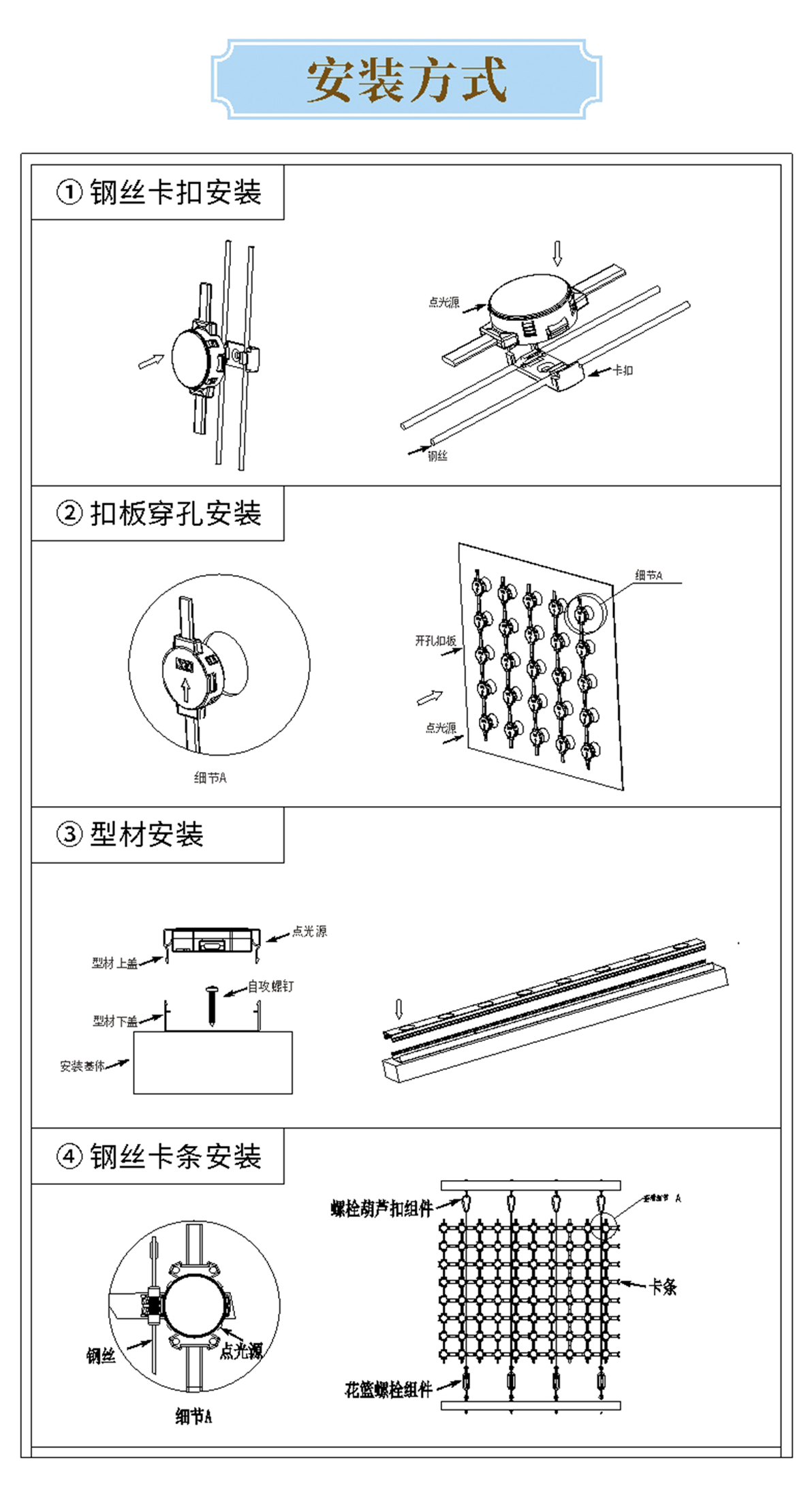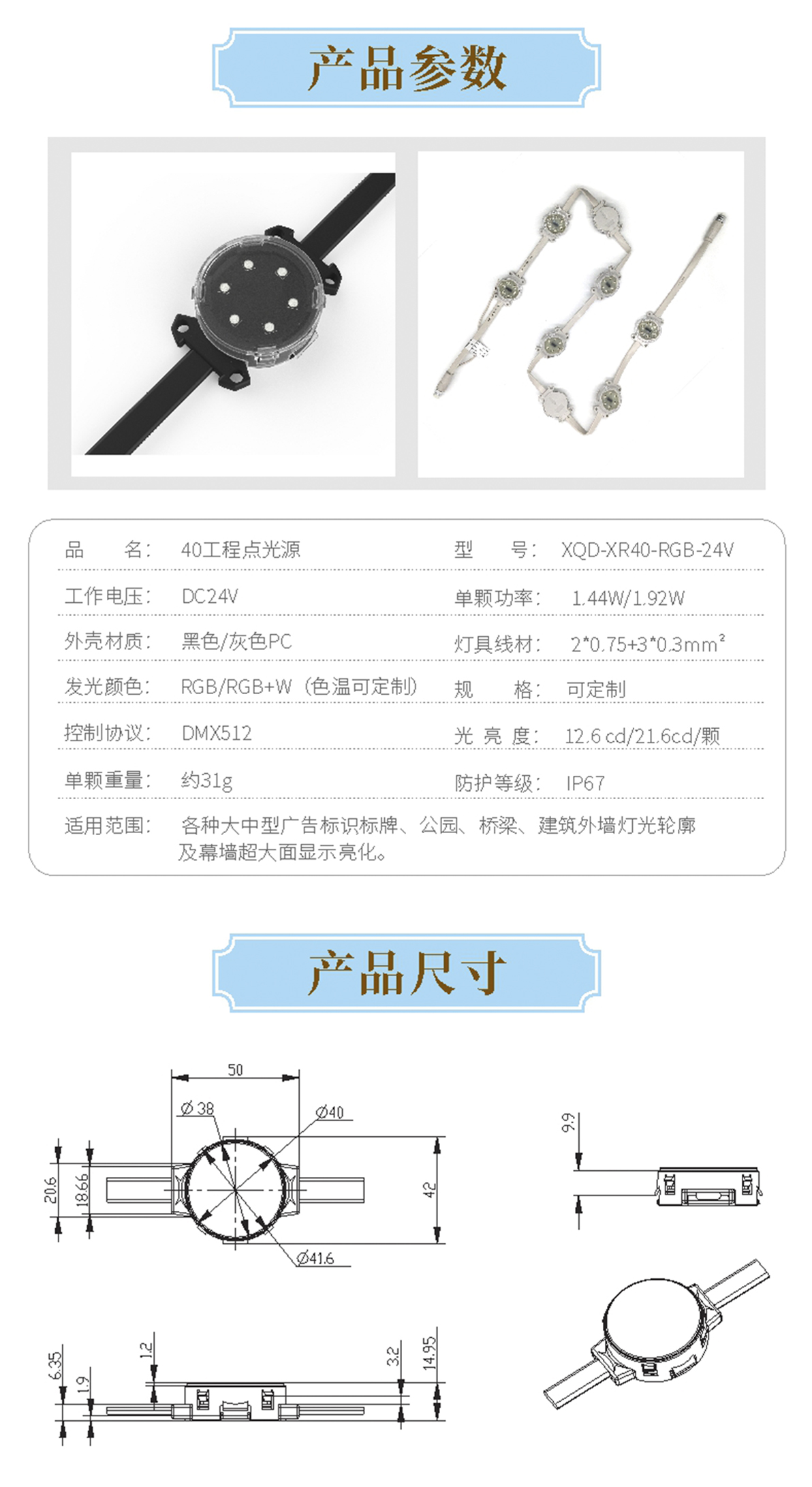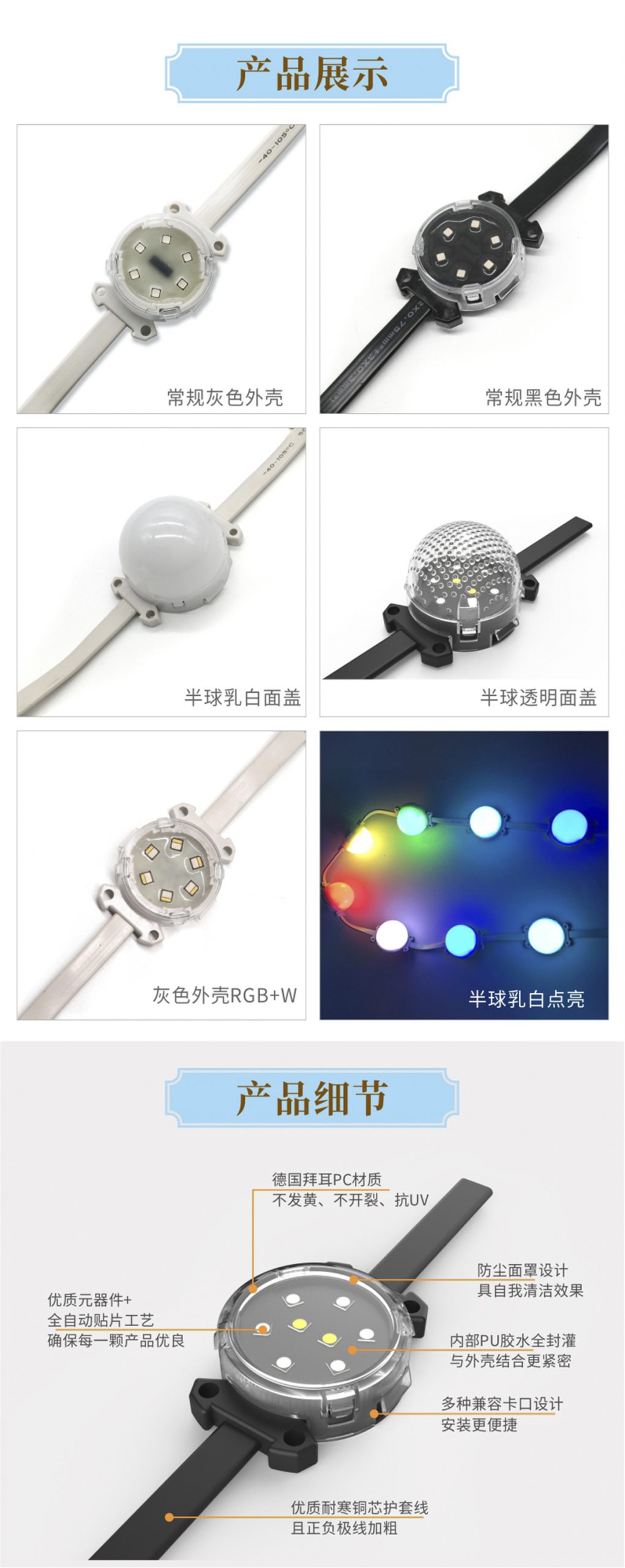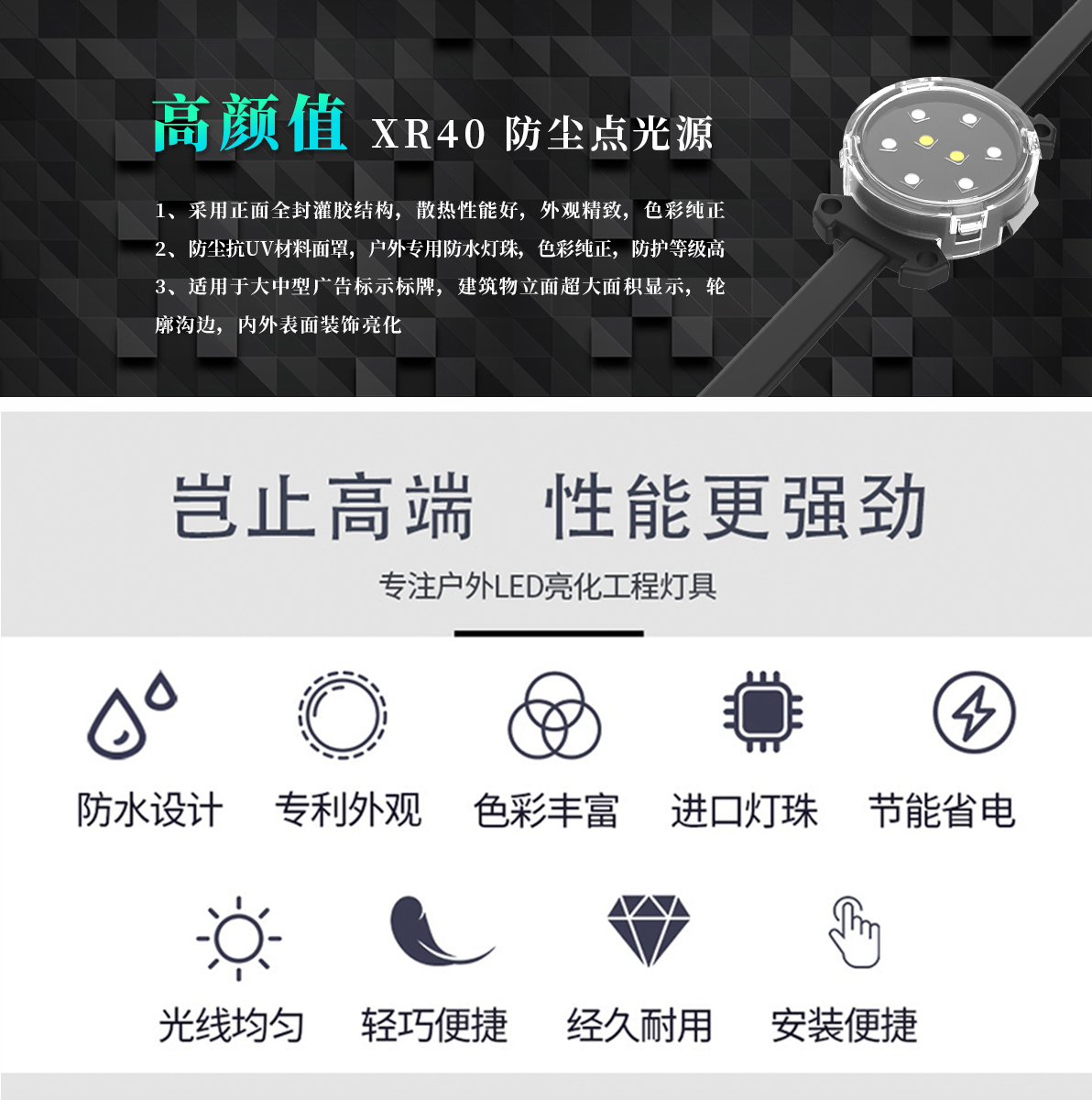 產(chǎn)品特點(diǎn): 1.采用正面灌膠和獨(dú)特PC罩,防護(hù)等級(jí)高; 2.加厚型優(yōu)質(zhì)阻然膠料,抗UV、抗鹽霧、耐沖擊; 3.適應(yīng)多種安裝方式,安裝簡(jiǎn)單可靠; 4.優(yōu)質(zhì)進(jìn)口燈珠,亮度高、色彩純正,穩(wěn)定性好; 5.該產(chǎn)品做工優(yōu)良,性價(jià)比高,是大型建筑物的景觀亮化及大型橋梁燈光的理 想產(chǎn)品。 安裝方式:1.卡鋁槽 2.打孔安裝 3打螺絲固定 4.網(wǎng)格屏應(yīng)用