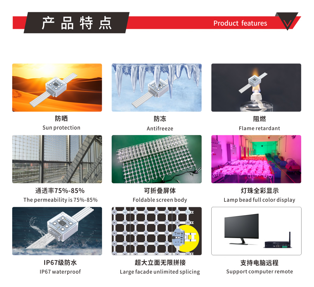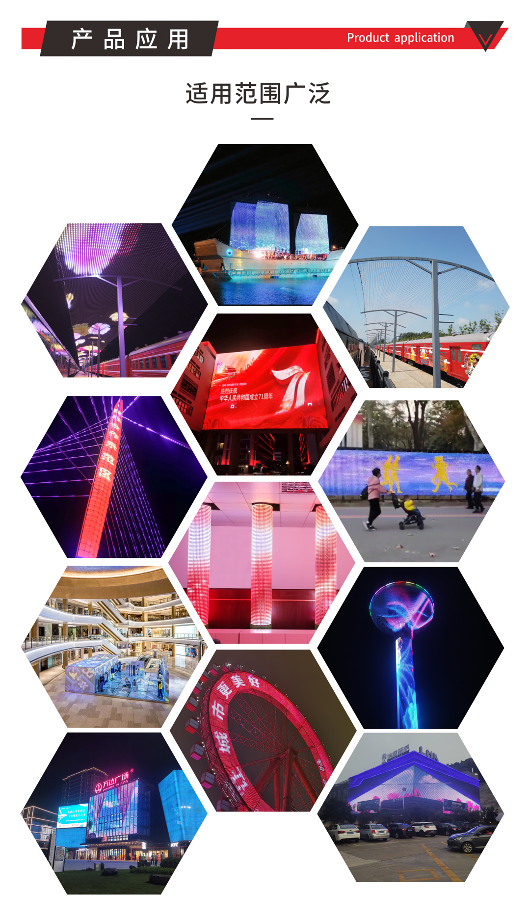 LED網(wǎng)格屏應(yīng)用場(chǎng)景 1. 商業(yè)展示與廣告 在商場(chǎng)、超市、專賣店等場(chǎng)所,LED網(wǎng)格屏可用于動(dòng)態(tài)廣告播放,吸引顧客注意力,提升品牌形象 ; 2. 體育場(chǎng)館 在體育賽事中,網(wǎng)格屏可實(shí)時(shí)轉(zhuǎn)播比賽畫面,營(yíng)造熱烈氛圍,并通過多角度布局為觀眾提供沉浸式觀賽體驗(yàn) 。 3. 公共信息傳播 在公共場(chǎng)所,如地鐵站、機(jī)場(chǎng)等,可用于播放新聞、天氣預(yù)報(bào)、交通信息等,為市民提供便捷服務(wù) 。 4. 演出與活動(dòng) 在演唱會(huì)、晚會(huì)等活動(dòng)中,網(wǎng)格屏可作為舞臺(tái)背景,展示燈光效果和視頻內(nèi)容,增強(qiáng)演出氛圍 。 5. 建筑外墻與廣告牌 其高通透率和輕薄設(shè)計(jì)使其成為玻璃幕墻、建筑墻體、戶外廣告牌的理想選擇,既美觀又不影響建筑外觀 6。 6. 智能家居與酒店 在酒店大堂或智能家居環(huán)境中,網(wǎng)格屏可用于展示服務(wù)信息、酒店特色或家居裝飾,提升用戶體驗(yàn) 。