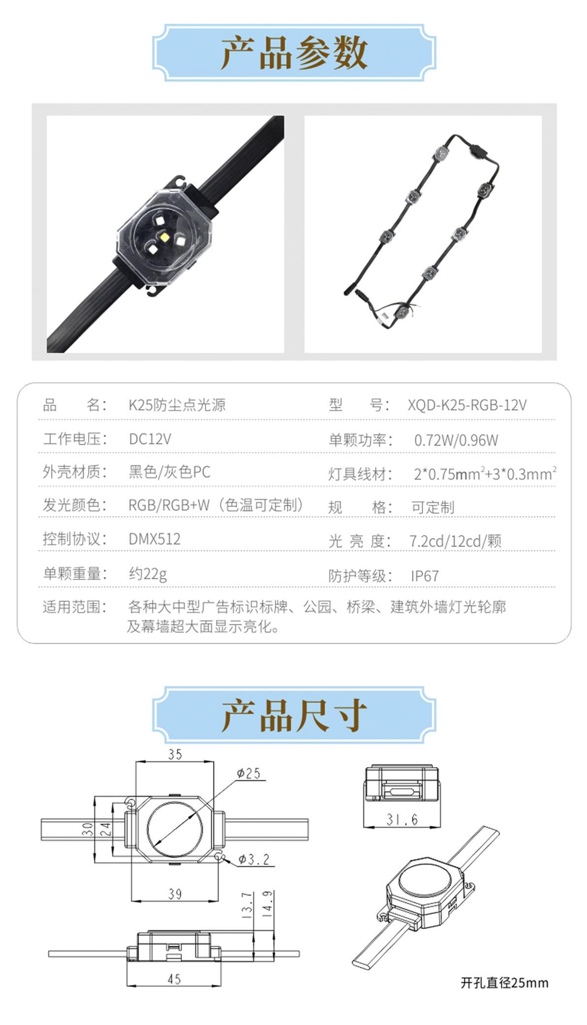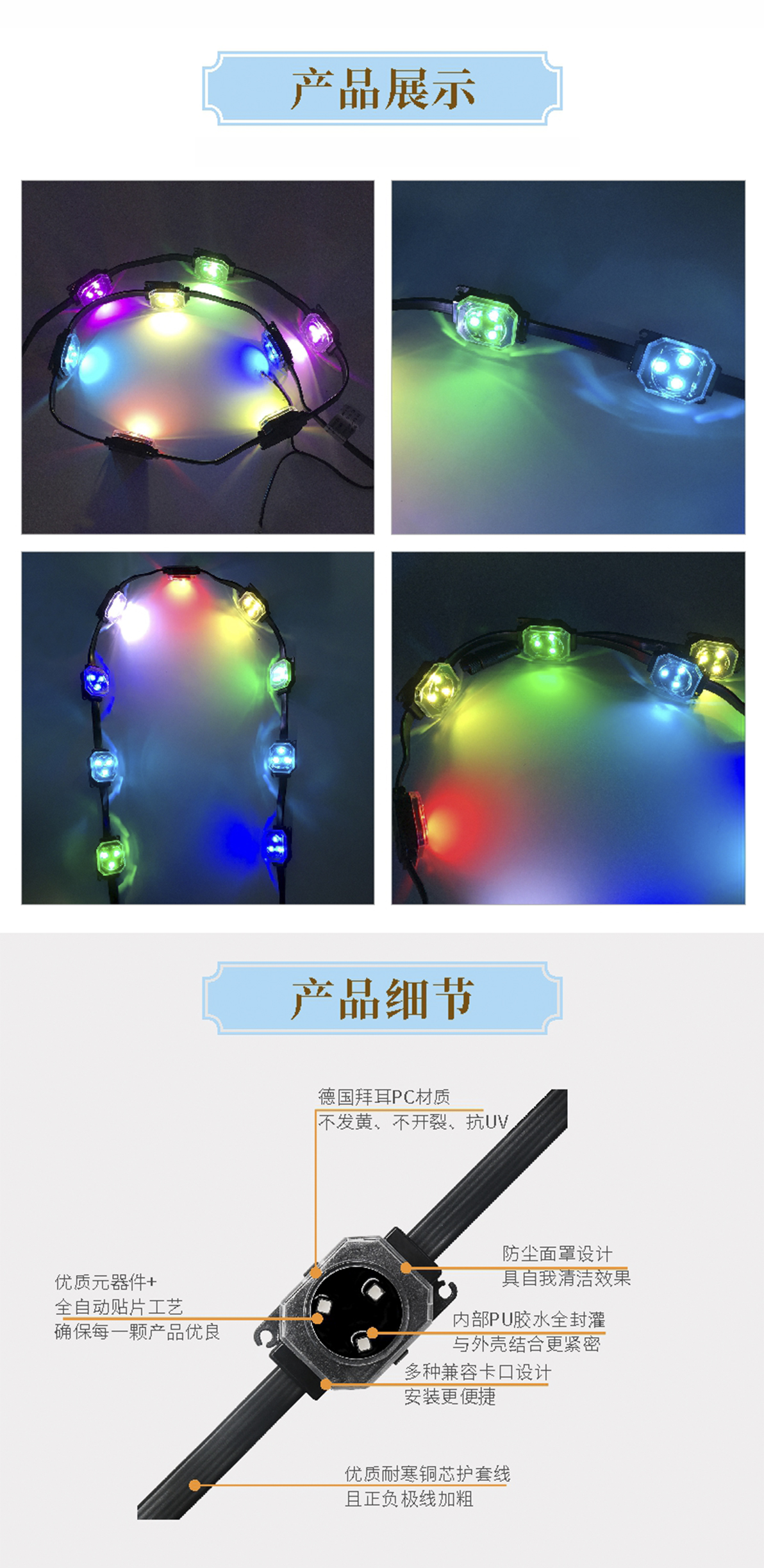 產(chǎn)品特點(diǎn): 1.采用正面灌膠和獨(dú)特PC罩,防護(hù)等級(jí)高; 2.加厚型優(yōu)質(zhì)阻然膠料,抗UV、抗鹽霧、耐沖擊; 3.適應(yīng)多種安裝方式,安裝簡(jiǎn)單可靠; 4.優(yōu)質(zhì)進(jìn)口燈珠,亮度高、色彩純正,穩(wěn)定性好; 5.該產(chǎn)品做工優(yōu)良,性價(jià)比高,是大型建筑物的景觀亮化及大型橋梁燈光的理 想產(chǎn)品。 安裝方式:1.卡鋁槽 2.裝鋼絲卡扣 3.打孔安裝 4.打螺絲固定