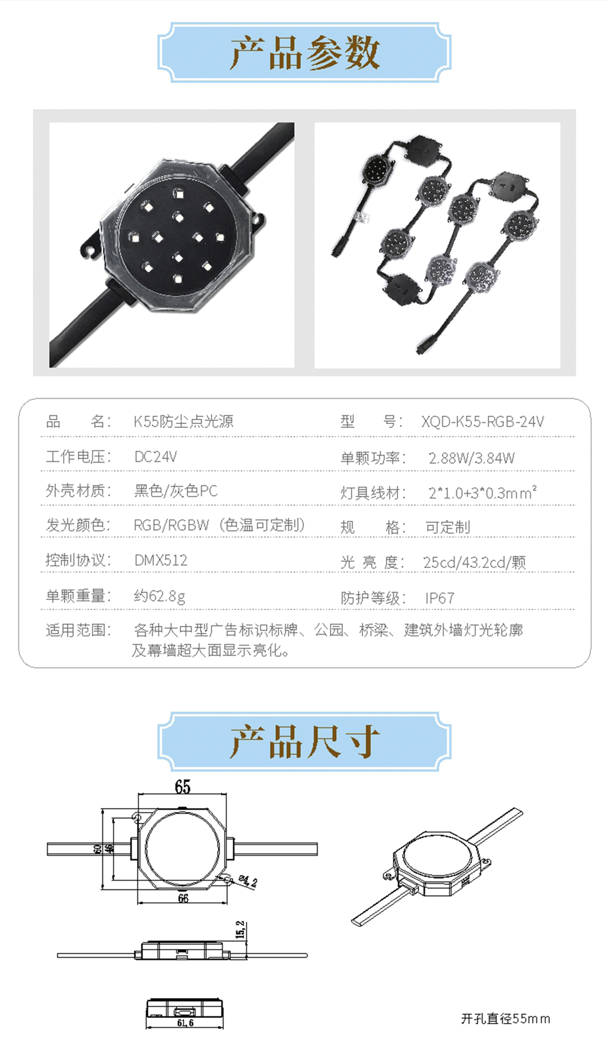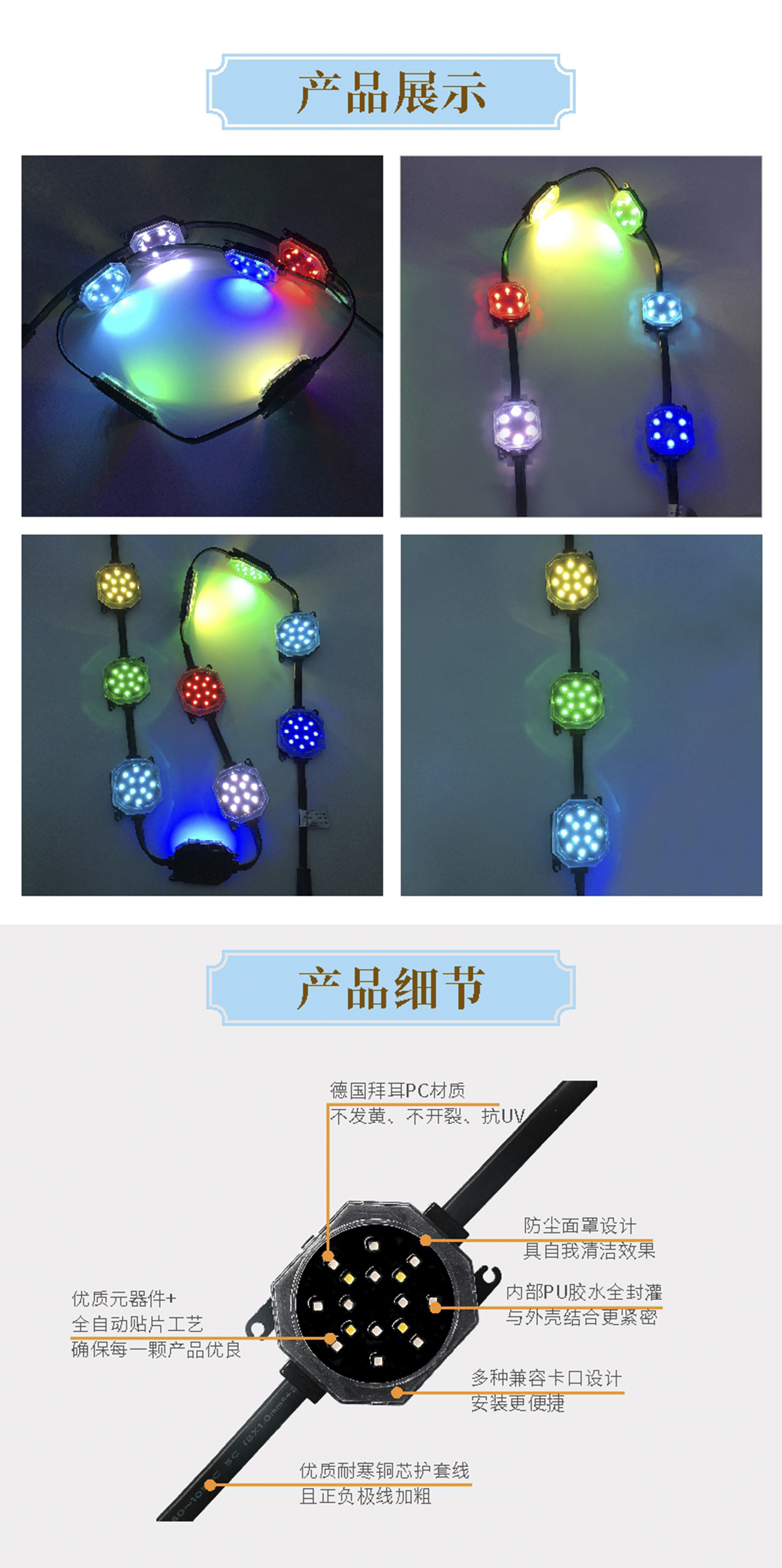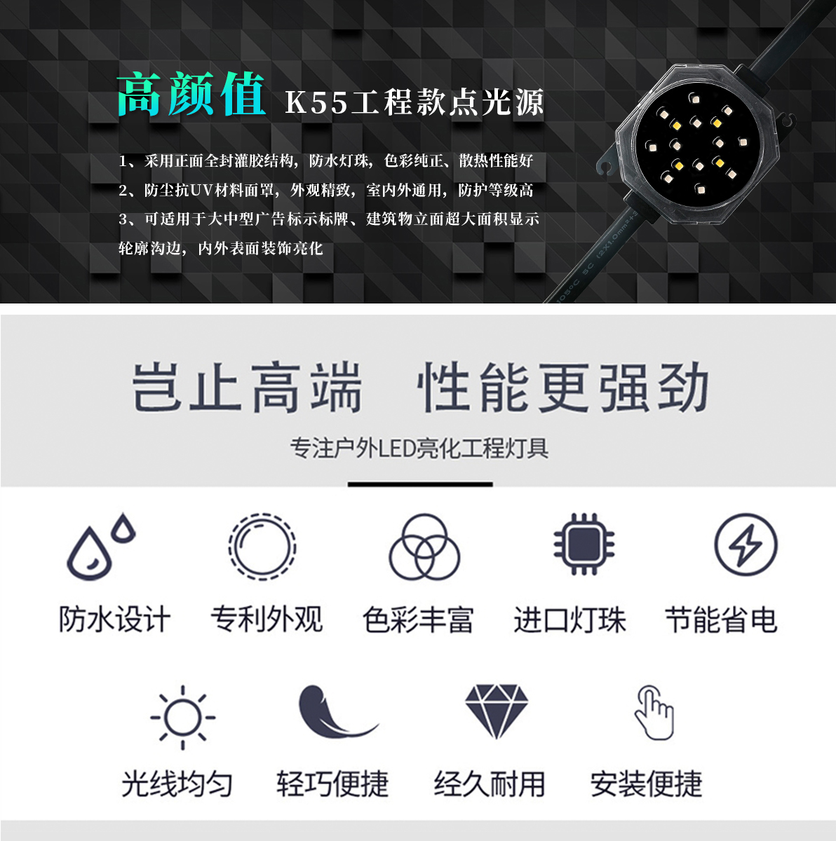 產(chǎn)品特點: 1.采用正面灌膠和獨特PC罩,防護等級高; 2.加厚型優(yōu)質(zhì)阻然膠料,抗UV、抗鹽霧、耐沖擊; 3.適應(yīng)多種安裝方式,安裝簡單可靠; 4.優(yōu)質(zhì)進口燈珠,亮度高、色彩純正,穩(wěn)定性好; 5.該產(chǎn)品做工優(yōu)良,性價比高,是大型建筑物的景觀亮化及大型橋梁燈光的理 想產(chǎn)品。 安裝方式:1.卡鋁槽 2.裝鋼絲卡扣 3.打孔安裝 4.打螺絲固定