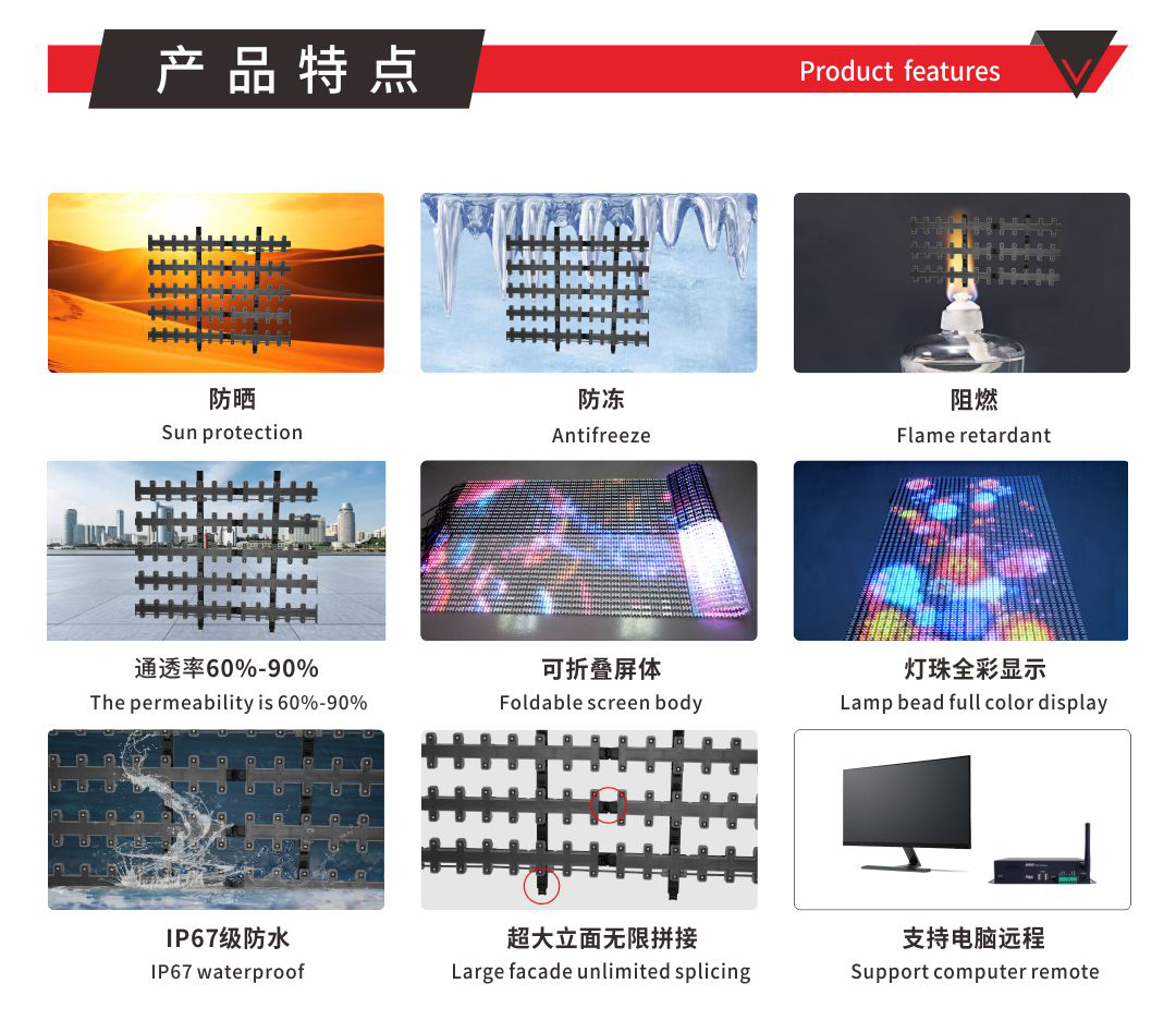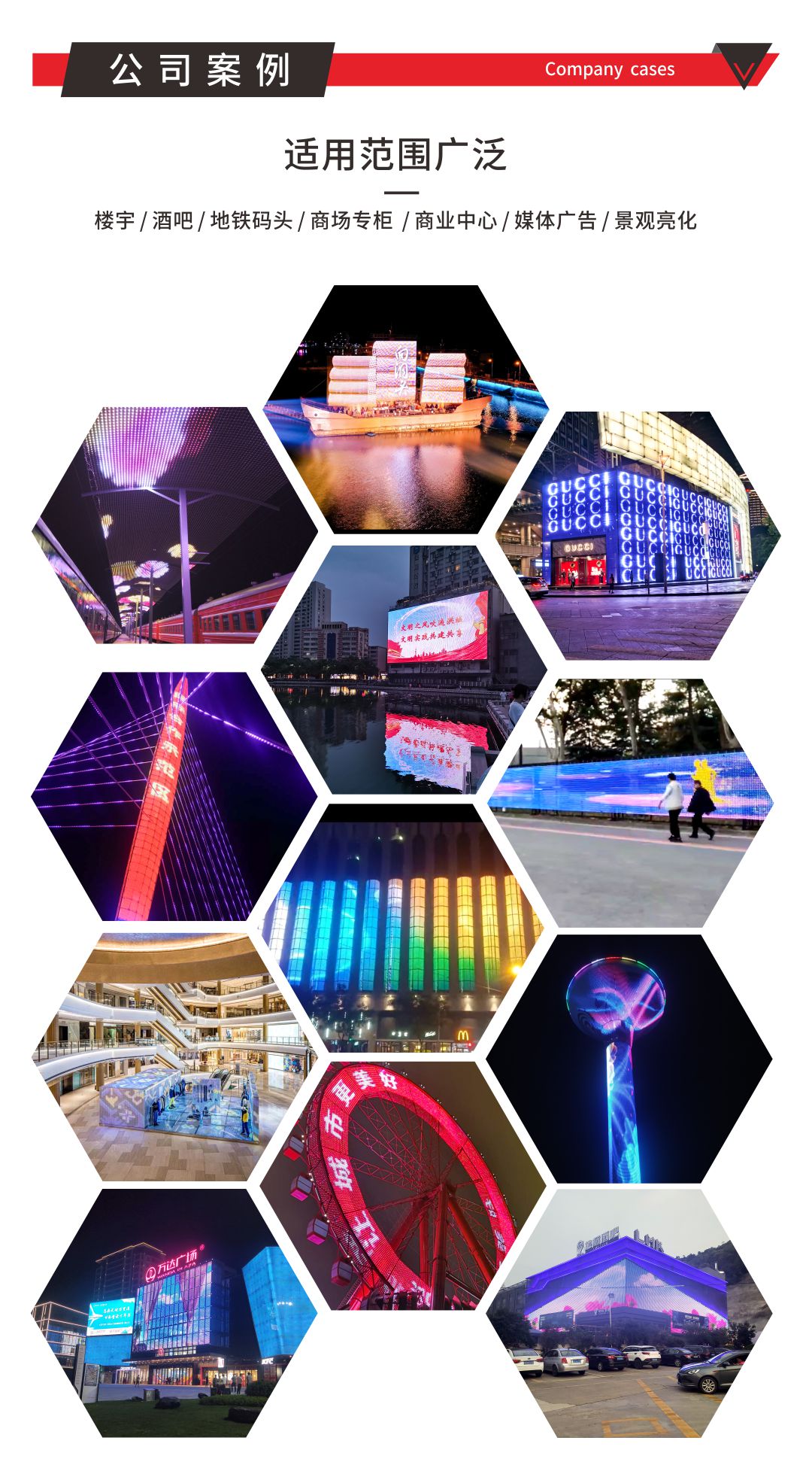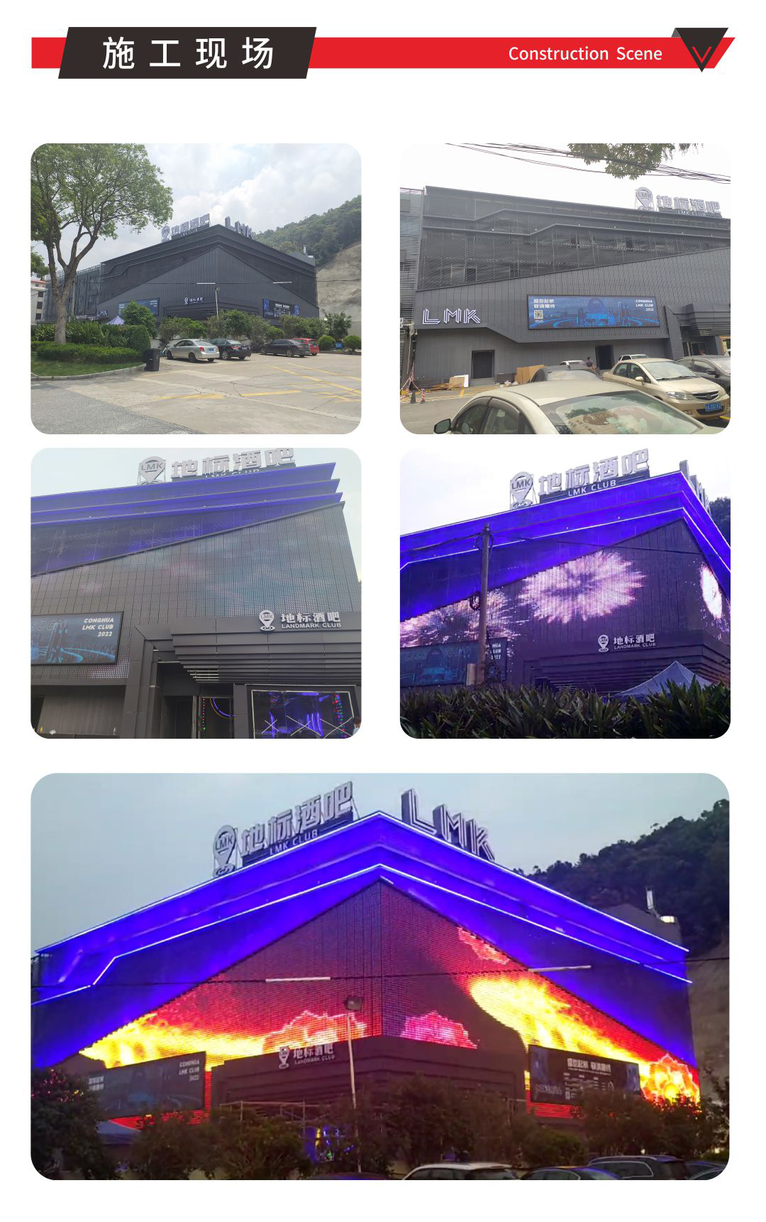 LED網(wǎng)格屏是一種新型顯示屏,以其獨(dú)特的結(jié)構(gòu)和優(yōu)異的性能在多個(gè)領(lǐng)域得到廣泛應(yīng)用。 一、技術(shù)特點(diǎn) 高清晰度 LED網(wǎng)格屏的像素密度極高,例如P3.91型號(hào)每平方米可達(dá)65536點(diǎn),清晰度在同類產(chǎn)品中處于領(lǐng)先水平,適合對(duì)畫面質(zhì)量要求高的場景。 高通透率 網(wǎng)格屏采用鏤空設(shè)計(jì),通透率可達(dá)80%-85%,能夠?qū)崿F(xiàn)見光不見燈的效果,不會(huì)遮擋視線或影響建筑采光,特別適合安裝在玻璃幕墻或建筑外墻。 高亮度和穩(wěn)定性 屏幕亮度可達(dá)4000-6000cd/平方米,支持高灰度等級(jí)和色彩飽和度,即使在戶外強(qiáng)光環(huán)境下也能保持畫面清晰。 厚度僅為3-6毫米,重量輕(約1公斤/平方米),對(duì)建筑物的承重要求低,安裝時(shí)無需額外鋼結(jié)構(gòu)支撐,節(jié)省空間。 靈活可塑 網(wǎng)格屏支持彎曲和剪裁,能夠?qū)崿F(xiàn)多種異形設(shè)計(jì),滿足創(chuàng)意需求,例如曲面顯示或特殊造型。 低功耗與節(jié)能環(huán)保 運(yùn)行功耗低,每平方米功耗≤150W,最大功耗≤400W,且無需額外空調(diào)散熱,節(jié)能環(huán)保。 高防護(hù)等級(jí) 防護(hù)等級(jí)達(dá)IP65或IP68,具備防水、防塵、抗腐蝕等特性,適合戶外復(fù)雜環(huán)境使用。