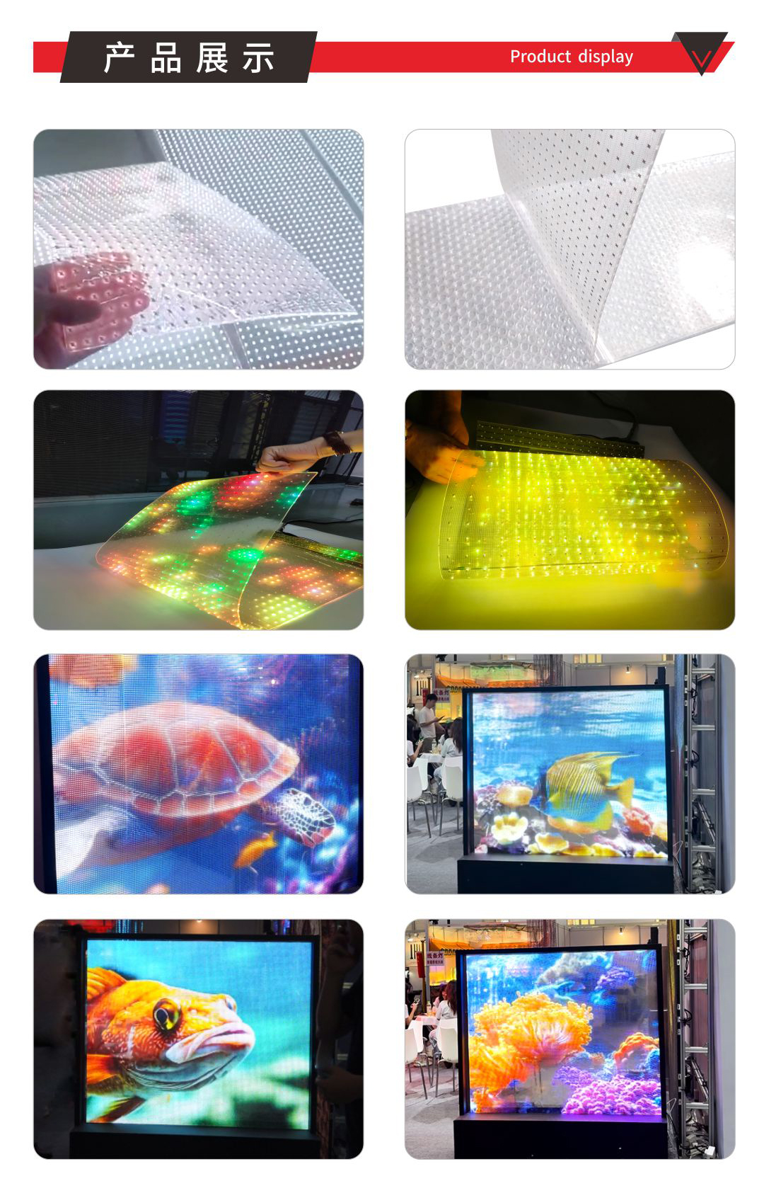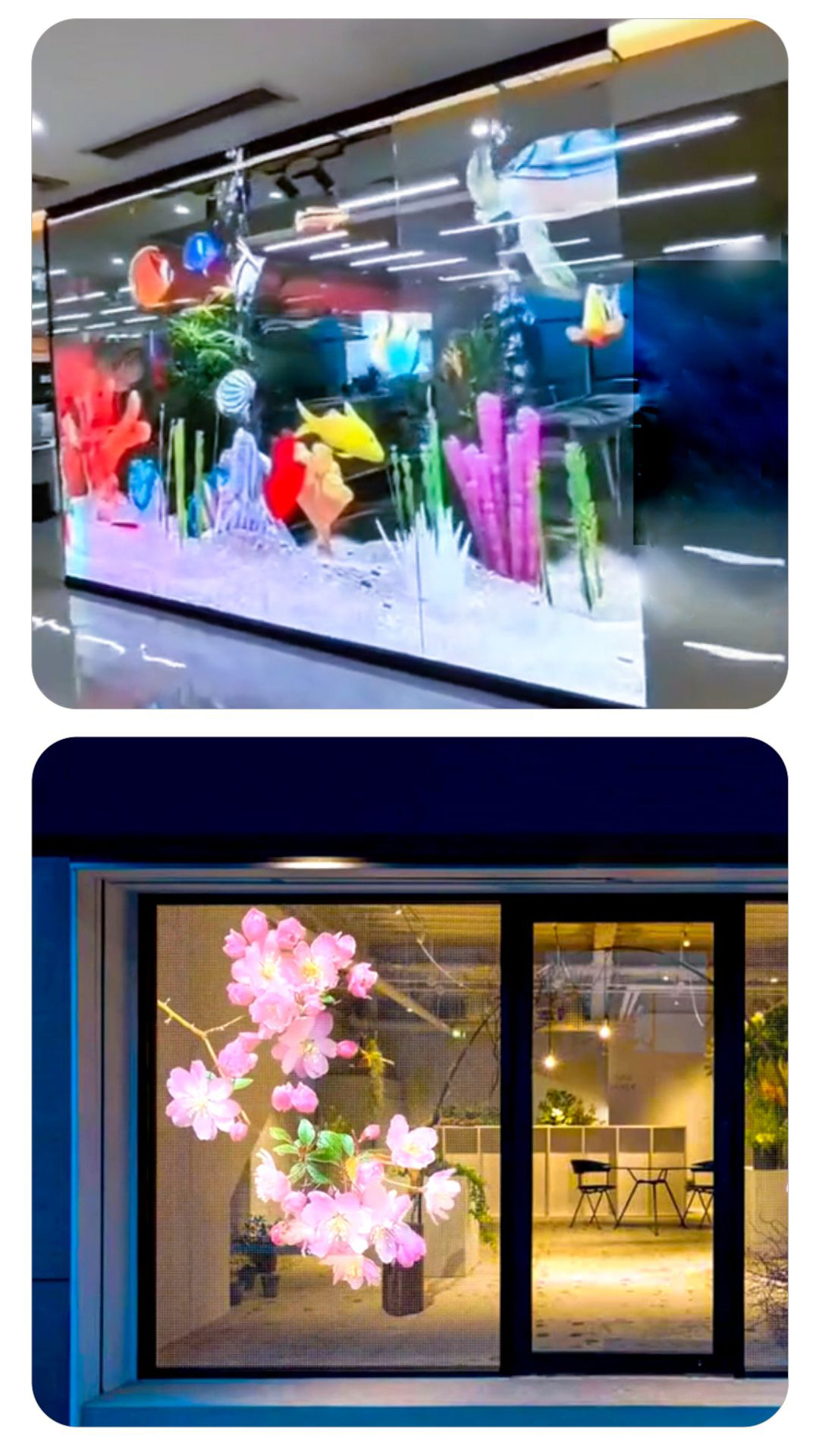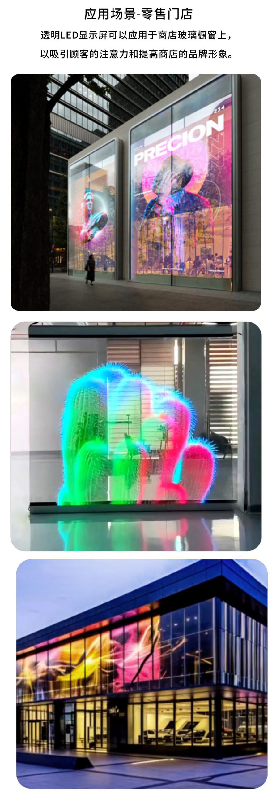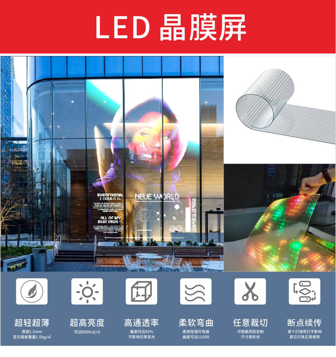 LED晶膜屏是一種先進的顯示技術(shù),憑借其獨特的特性和廣泛的應(yīng)用場景,正在成為透明顯示領(lǐng)域的重要創(chuàng)新產(chǎn)品。 技術(shù)特性: 高通透率 LED晶膜屏的透光率可高達95%,能夠?qū)崿F(xiàn)極佳的透明效果,在非播放狀態(tài)下幾乎隱形,不影響建筑采光和整體美觀。 輕薄便攜 屏幕厚度僅為1.5毫米,重量約為1.5公斤每平方米,非常輕薄,便于安裝和運輸。 可彎曲與可裁剪 晶膜屏采用柔性透明薄膜制作,能夠根據(jù)需求彎曲或裁剪成各種形狀,適應(yīng)不同安裝場景,例如曲面、弧形等。 高亮度和色彩表現(xiàn) 采用高亮度LED燈珠作為顯示元件,具有高對比度、高亮度和高色彩飽和度,即使在明亮環(huán)境下也能清晰顯示。 先進工藝技術(shù) 采用LED燈珠裸晶植球技術(shù),結(jié)合透明晶膜膠片和真空封膠工藝,確保顯示均勻性和耐用性。
