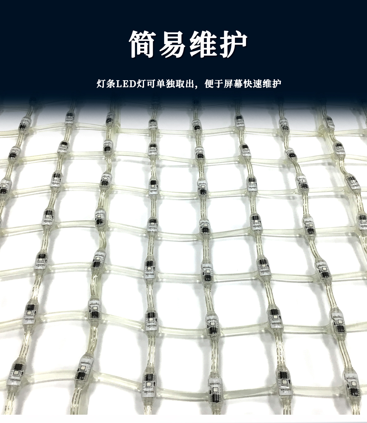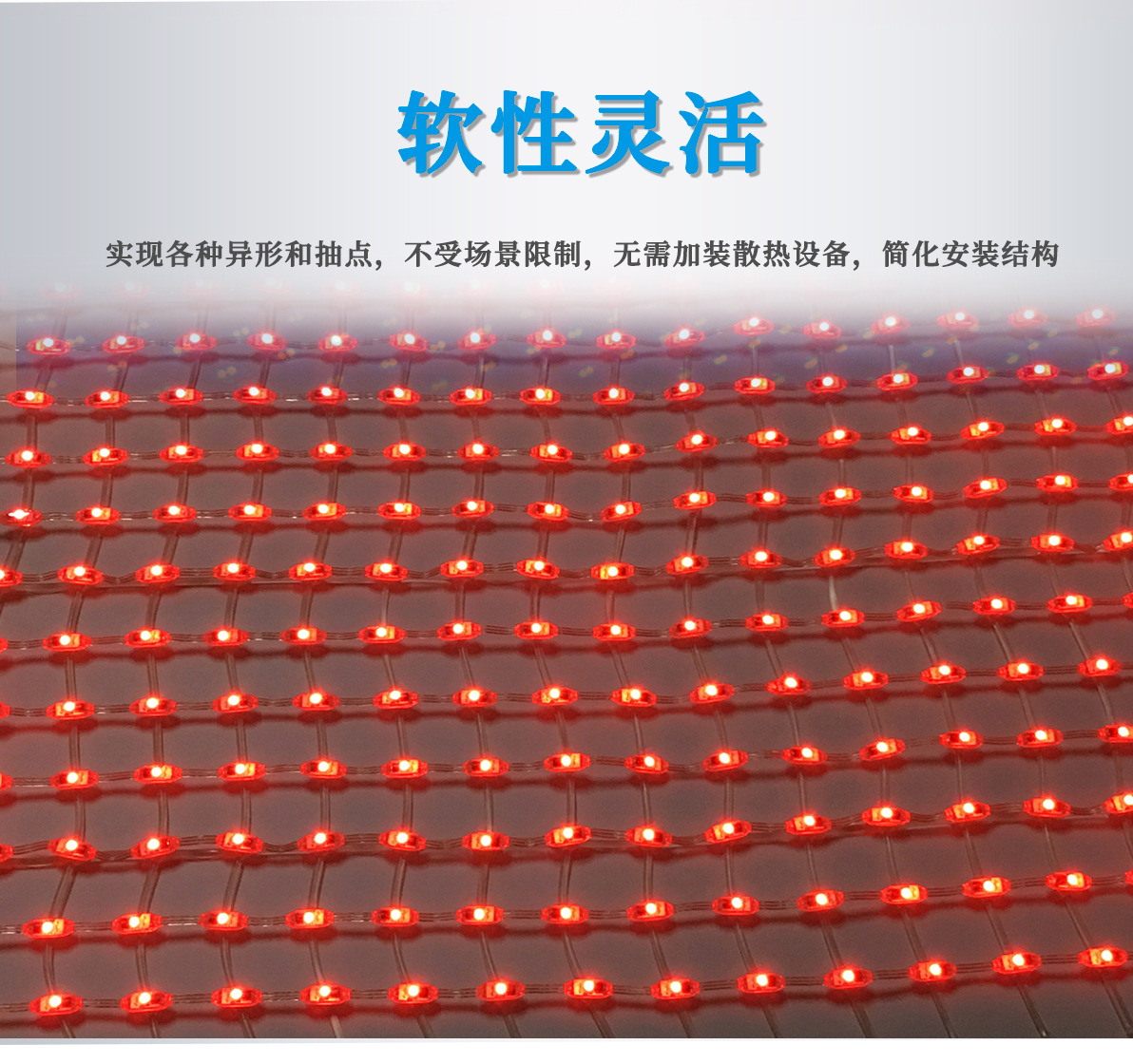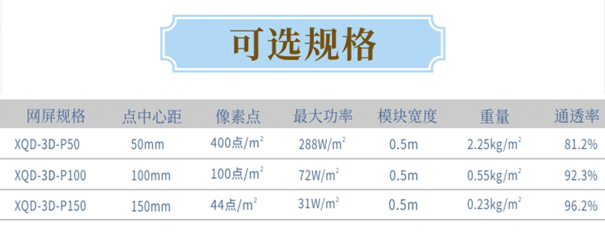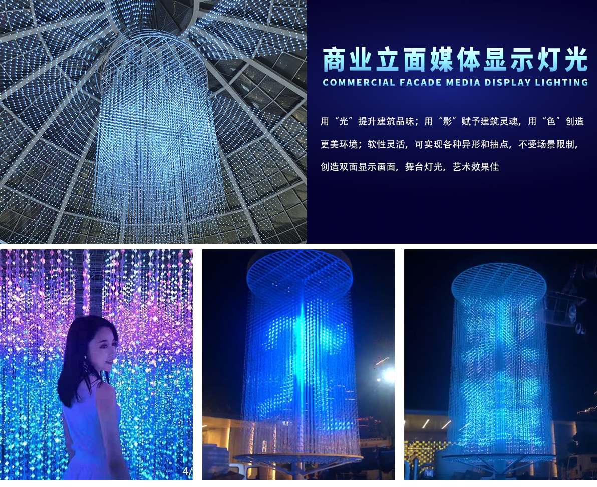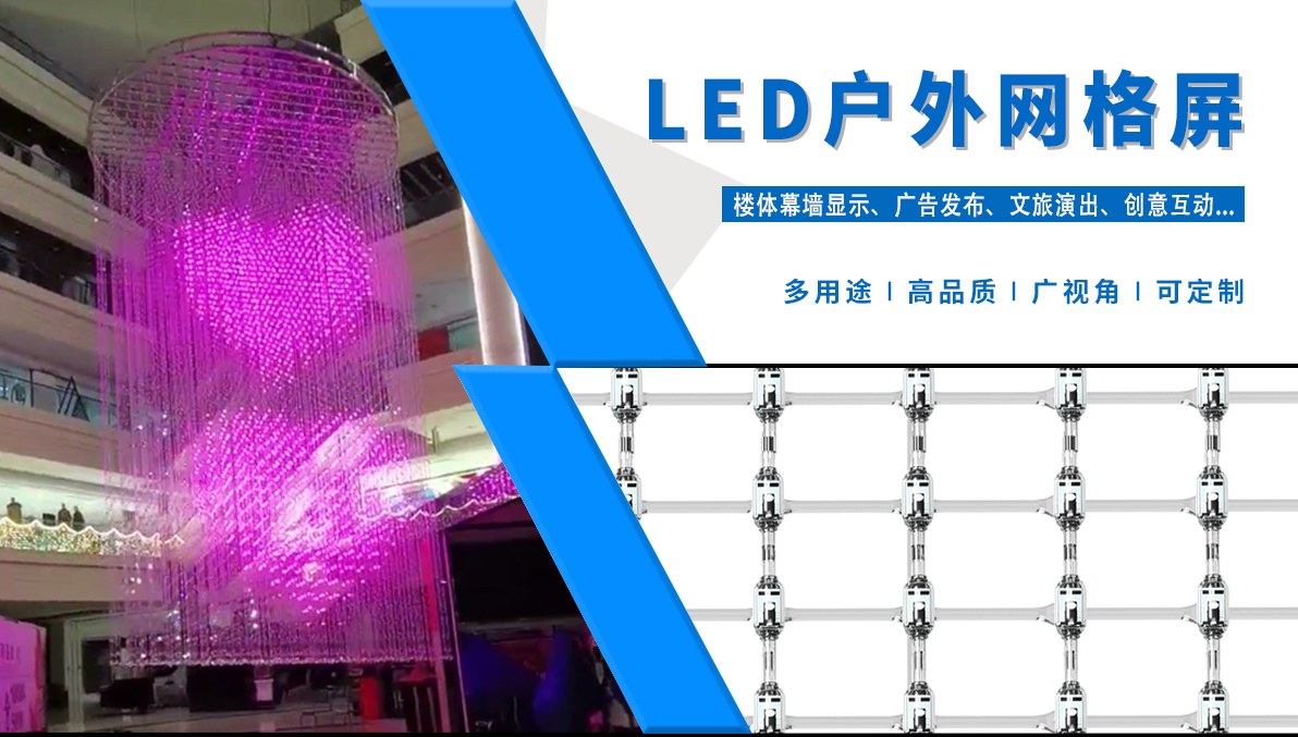 產品特點: 1.采用一體成型工藝,防護等級高; 2.產品體積小,外觀精致,室內外通用 3.優(yōu)質阻然膠料,抗UV、抗鹽霧; 4.可適用于大中型廣告標示標牌、點陣屏、輪廓亮化。 產品簡介: LED柔性網格屏,具有透明,靈活,輕便,易于安裝和維護的特點,適合于多種安裝方式,比如彎曲,折疊,卷繞,懸掛等,做為一個整體透明LED網格屏.極具藝術性和創(chuàng)造性,可以自由組合成各種形狀。比常規(guī)網格屏通透度更高,柔性更好,適合各種異形裝飾。 技術要求說明: 1.掛墻安裝時可直接打鏍絲固定吊裝 2.可在各種特殊造型如山峰等,平鋪之上后完整還原造型形狀