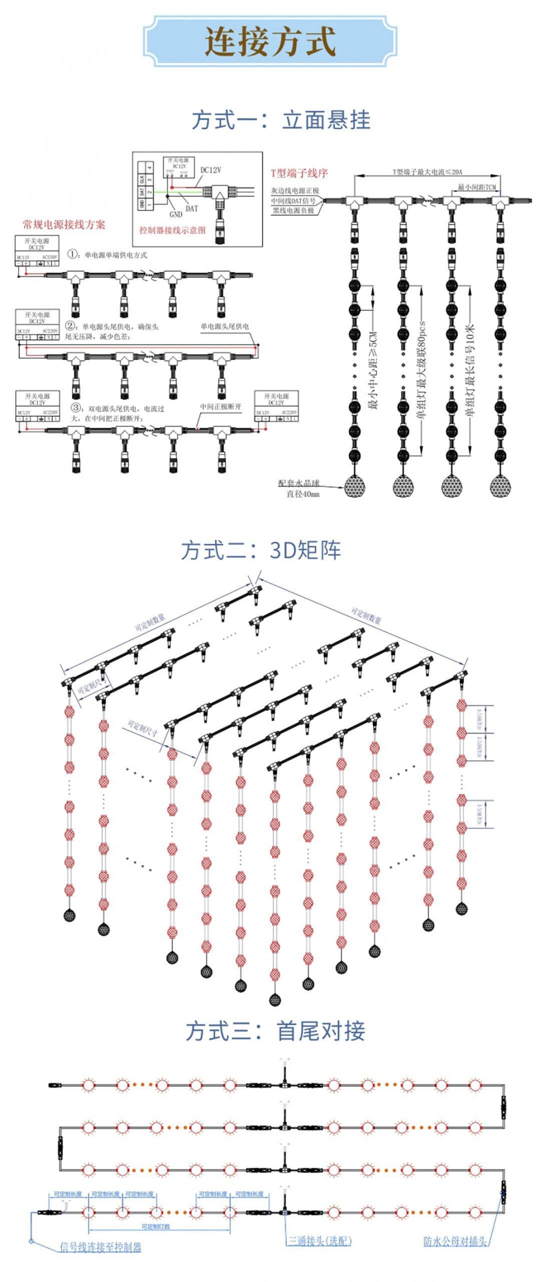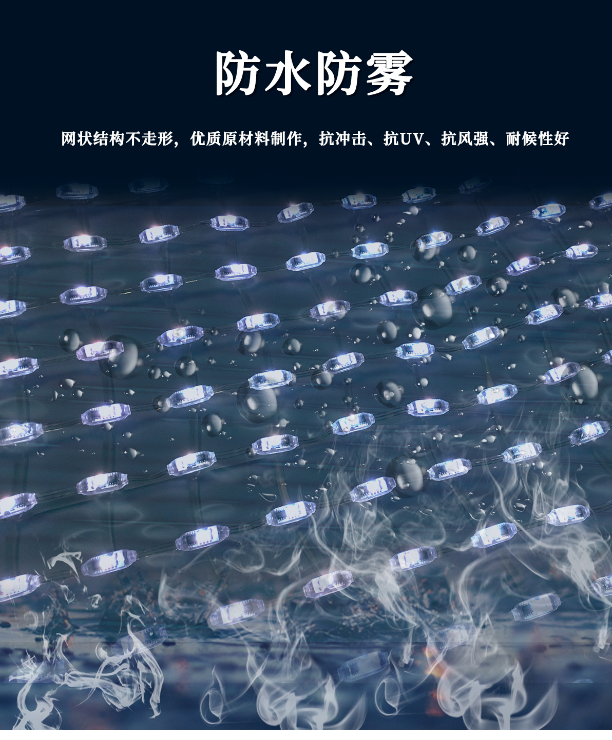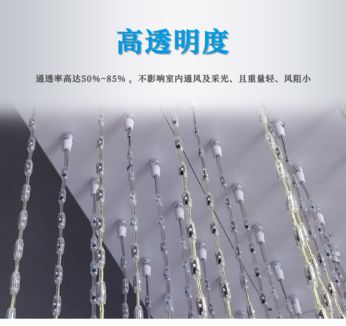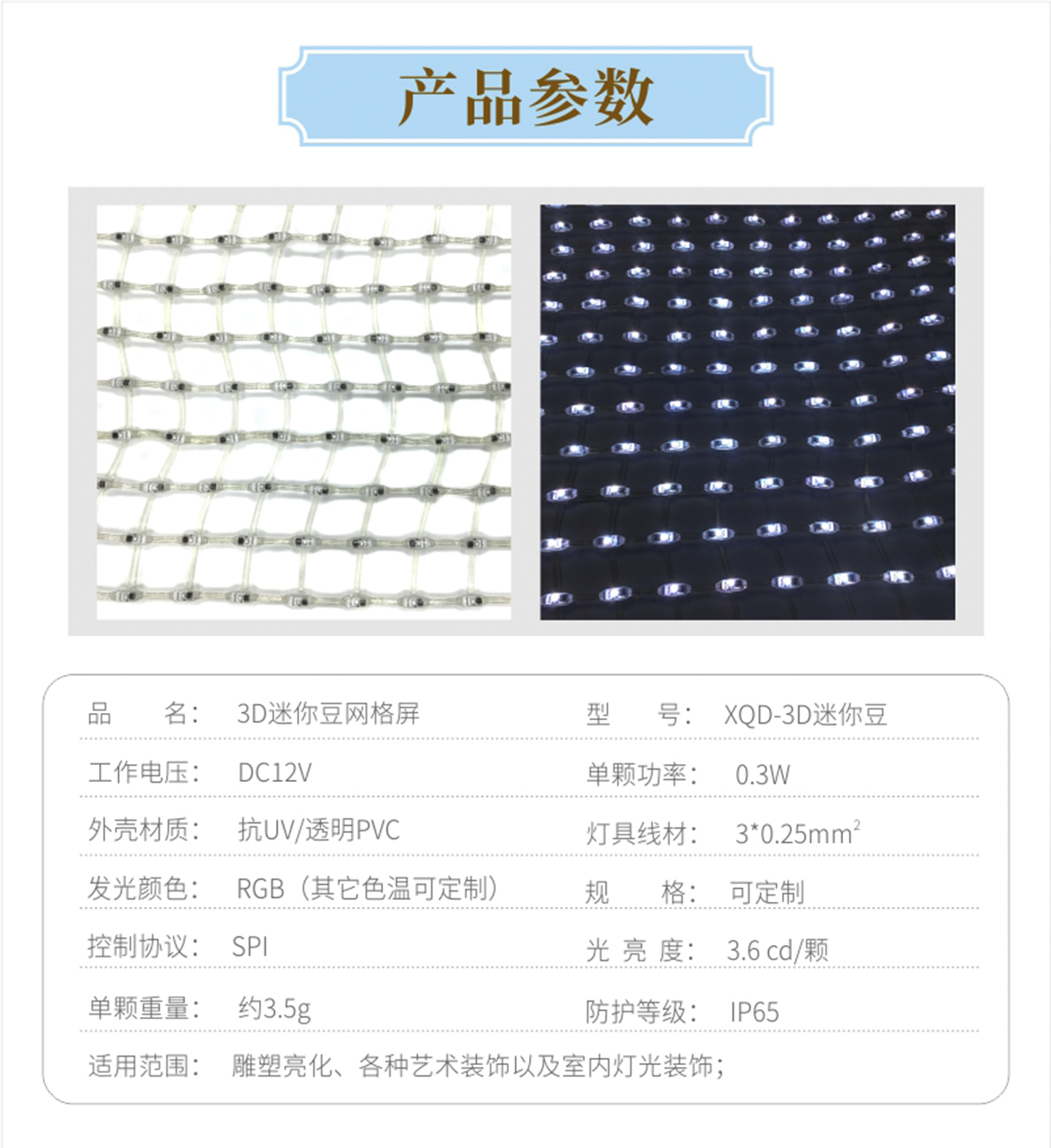 產品特點: 1.采用一體成型工藝,防護等級高; 2.產品體積小,外觀精致,室內外通用 3.優(yōu)質阻然膠料,抗UV、抗鹽霧; 4.可適用于大中型廣告標示標牌、點陣屏、輪廓亮化。 產品簡介: LED柔性網格屏,具有透明,靈活,輕便,易于安裝和維護的特點,適合于多種安裝方式,比如彎曲,折疊,卷繞,懸掛等,做為一個整體透明LED網格屏.極具藝術性和創(chuàng)造性,可以自由組合成各種形狀。比常規(guī)網格屏通透度更高,柔性更好,適合各種異形裝飾。 技術要求說明: 1.掛墻安裝時可直接打鏍絲固定吊裝 2.可在各種特殊造型如山峰等,平鋪之上后完整還原造型形狀