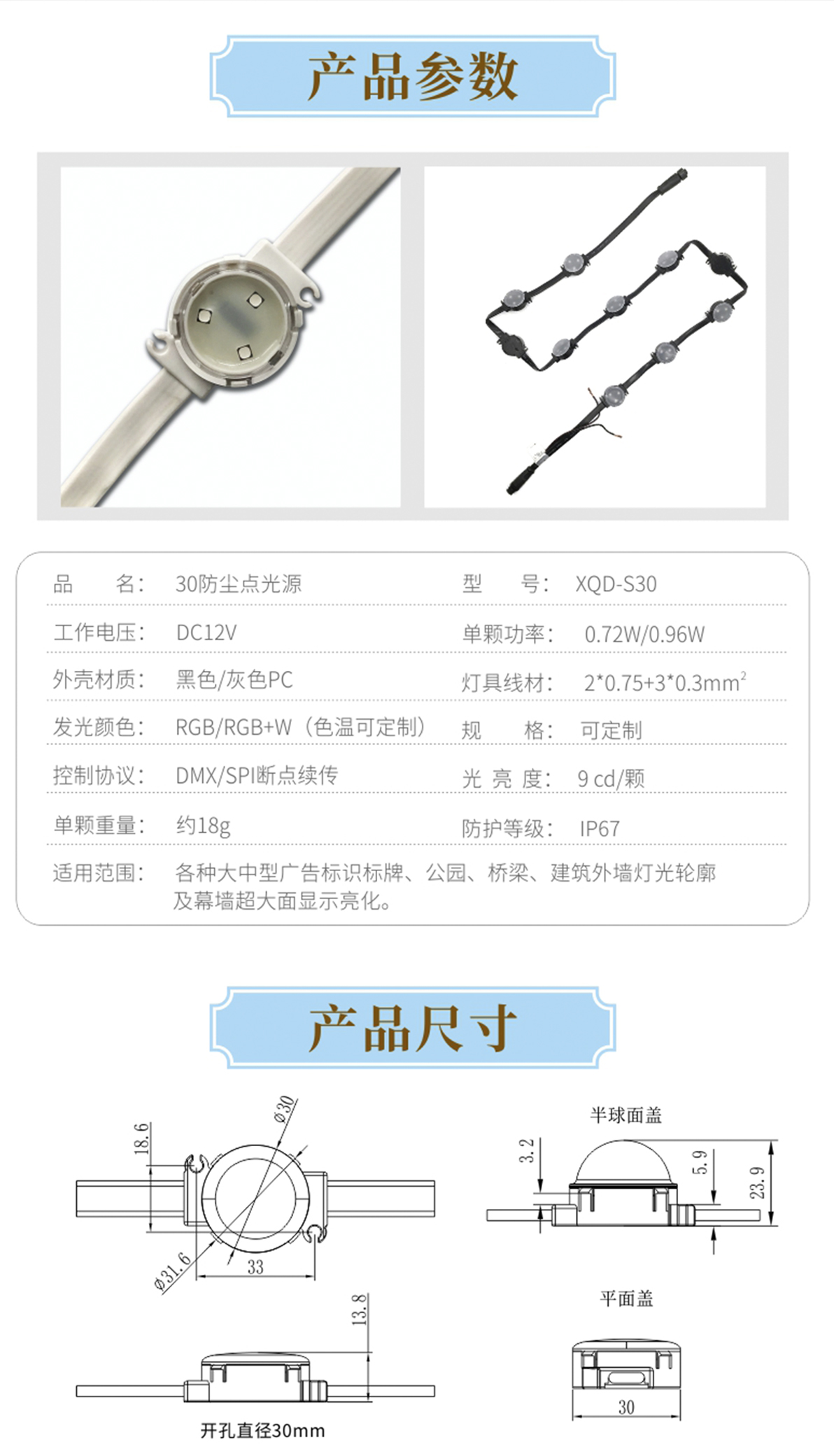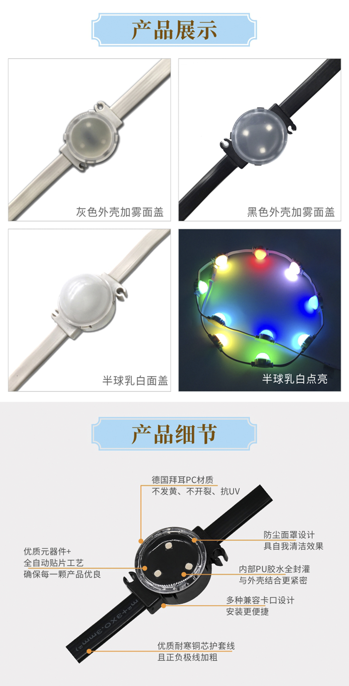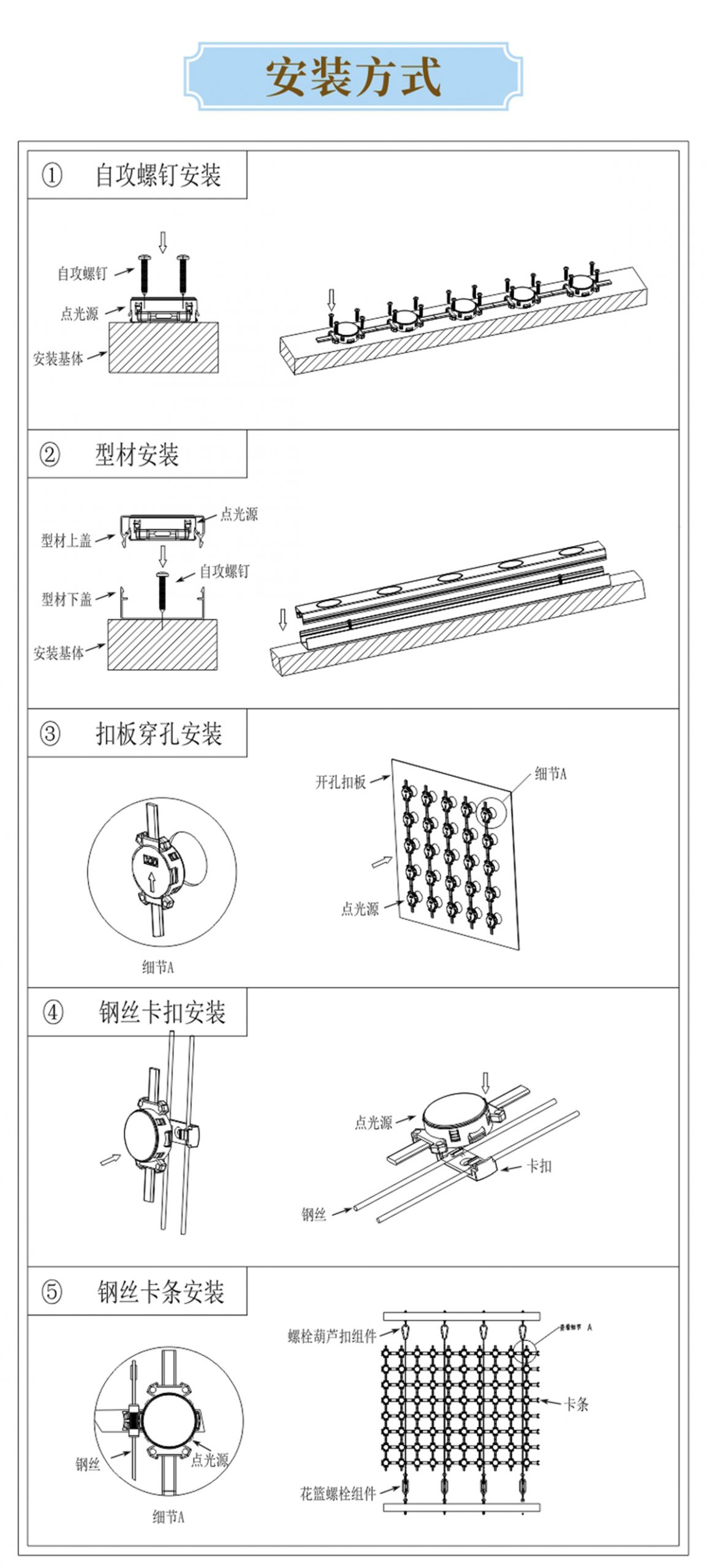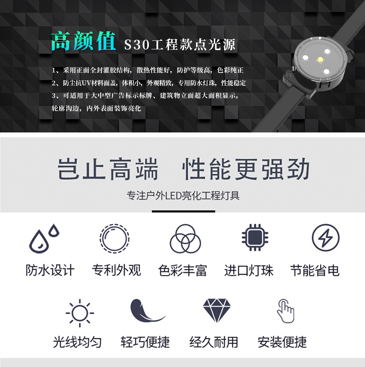 產(chǎn)品特點(diǎn); 1.采用正面全封灌膠結(jié)構(gòu),散熱性能好,防護(hù)等級(jí)高; 2.采用戶(hù)外專(zhuān)用防水燈珠,色彩純正,性能穩(wěn)定; 3.防塵抗 UV 材料面罩,體積小,外觀(guān)精致,室內(nèi)外通用; 4.可適用于大中型廣告標(biāo)示標(biāo)牌、建筑物立面超大面積顯示, 輪廓溝邊,內(nèi)外表面裝飾亮化; 安裝方式: 1.卡鋁槽 2.裝鋼絲卡扣 3.打螺絲固定