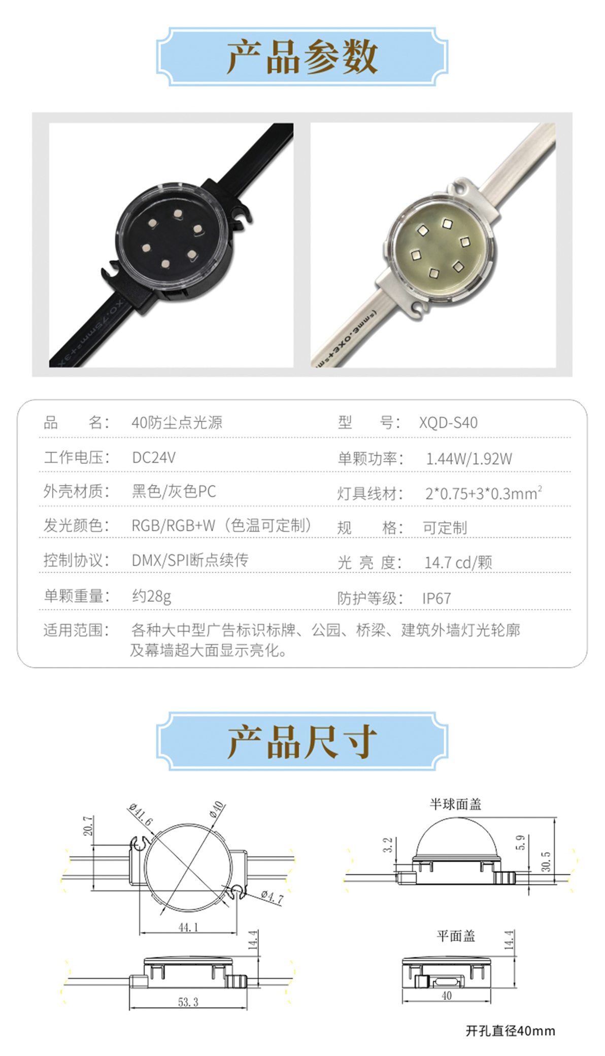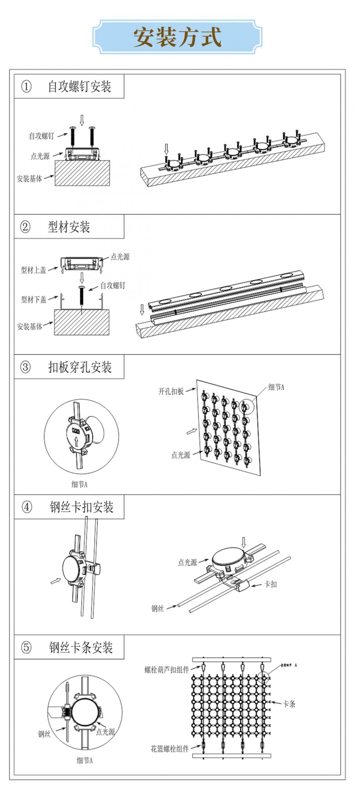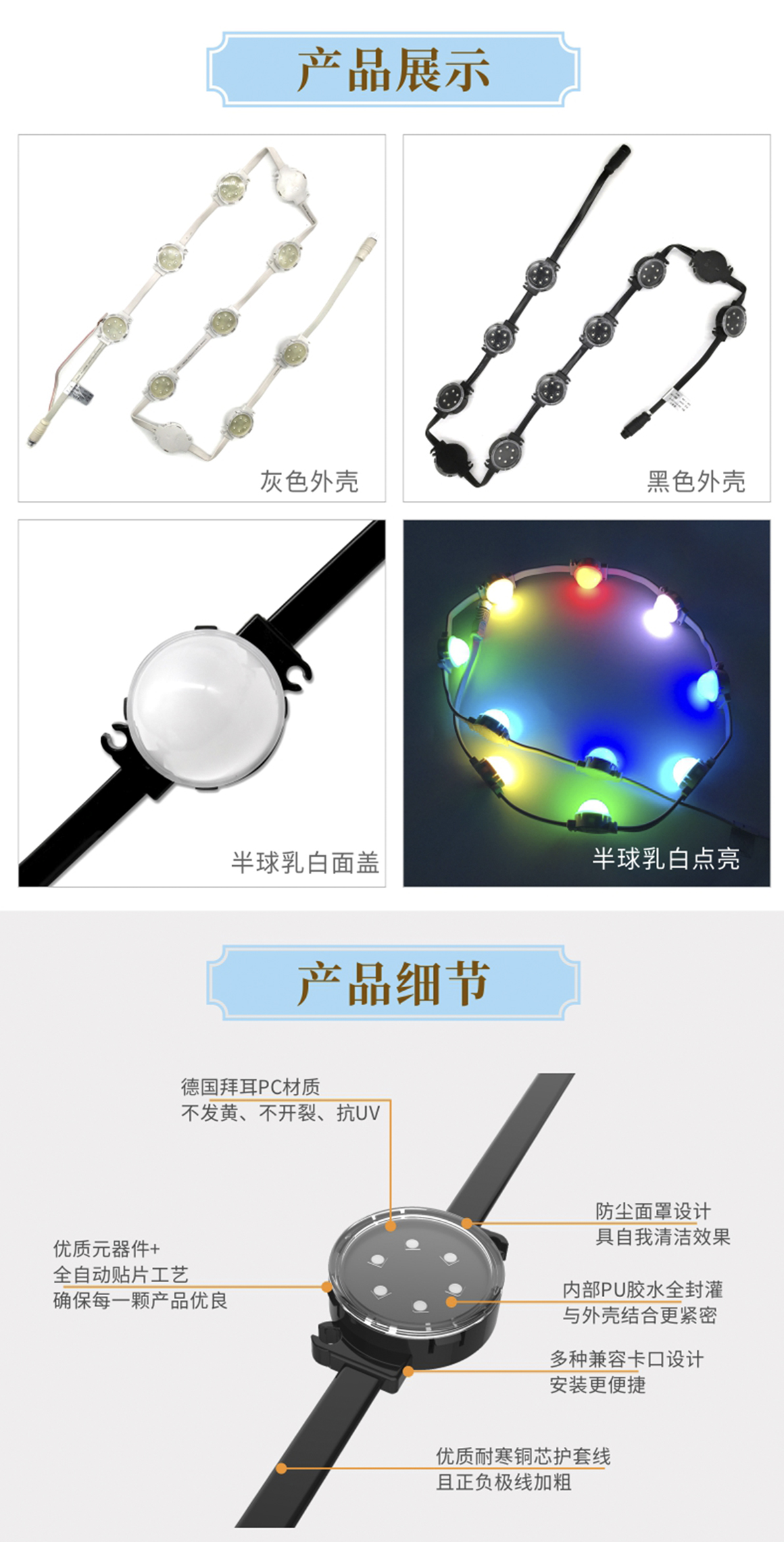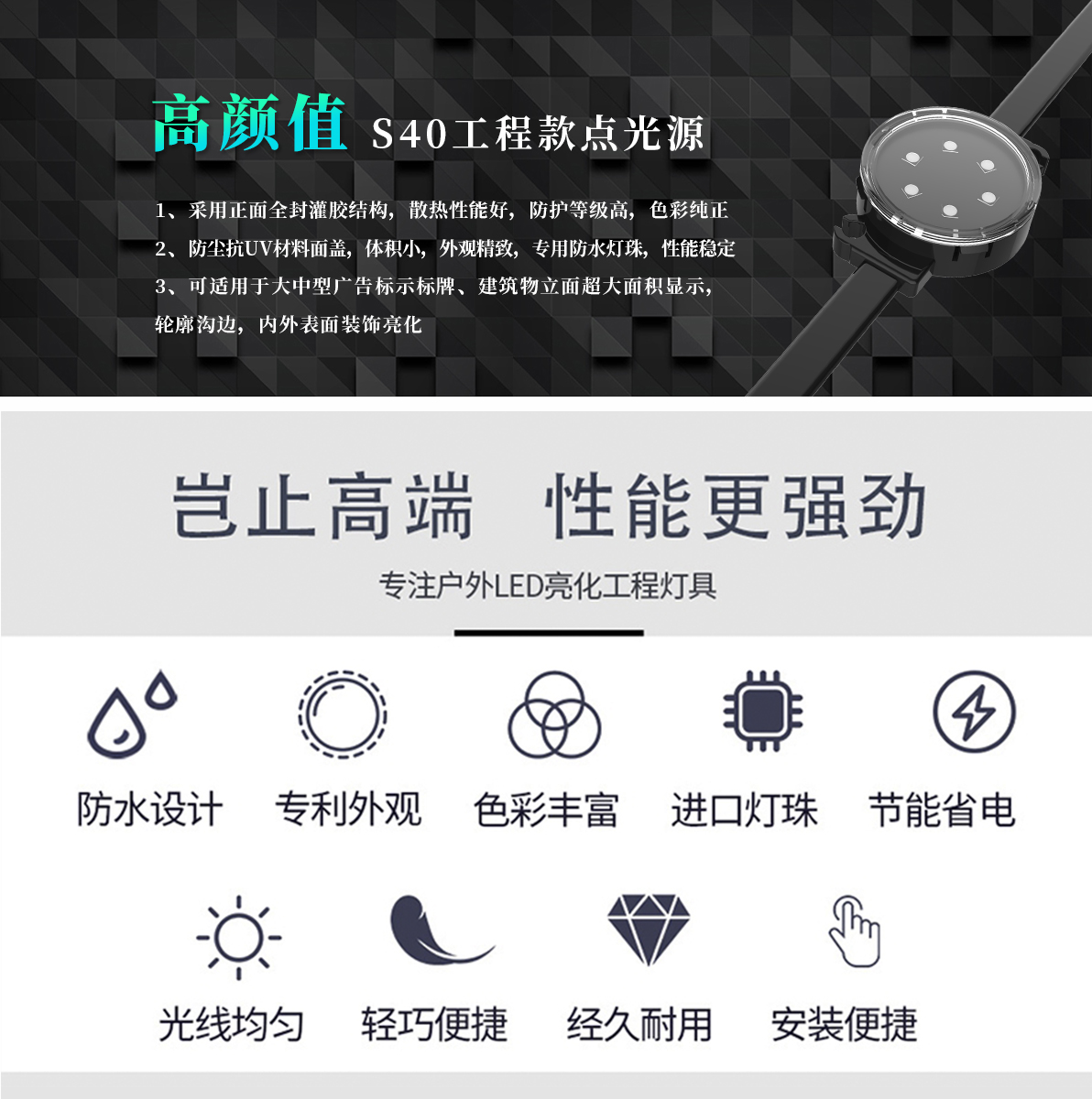 產(chǎn)品特點(diǎn): 1.采用正面全封灌膠結(jié)構(gòu),散熱性能好,防護(hù)等級(jí)高; 2.采用戶外專用防水燈珠,色彩純正,性能穩(wěn)定; 3.防塵抗 UV 材料面罩,體積小,外觀精致,室內(nèi)外通用; 4.可適用于大中型廣告標(biāo)示標(biāo)牌、建筑物立面超大面積顯示, 輪廓溝邊,內(nèi)外表面裝飾亮化; 安裝方式: 1.卡鋁槽 2.裝鋼絲卡扣 3.打孔安裝