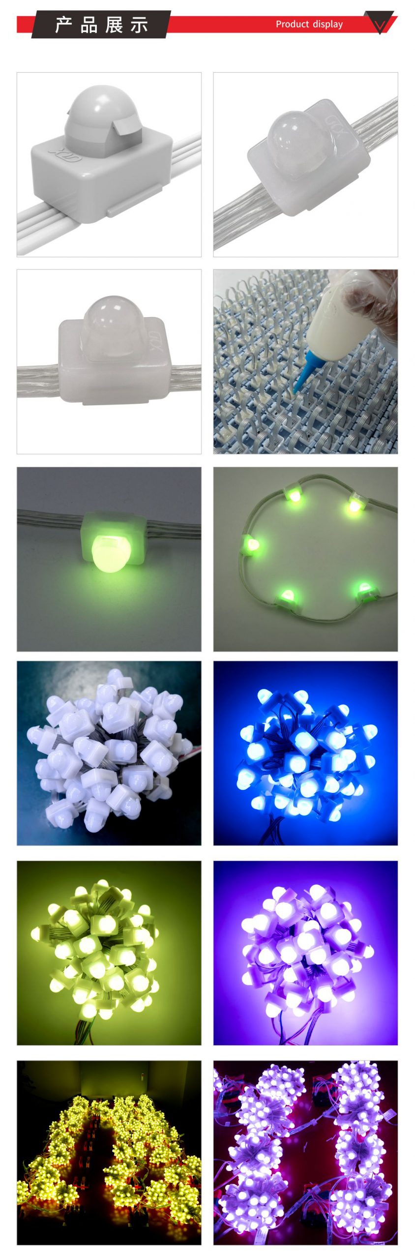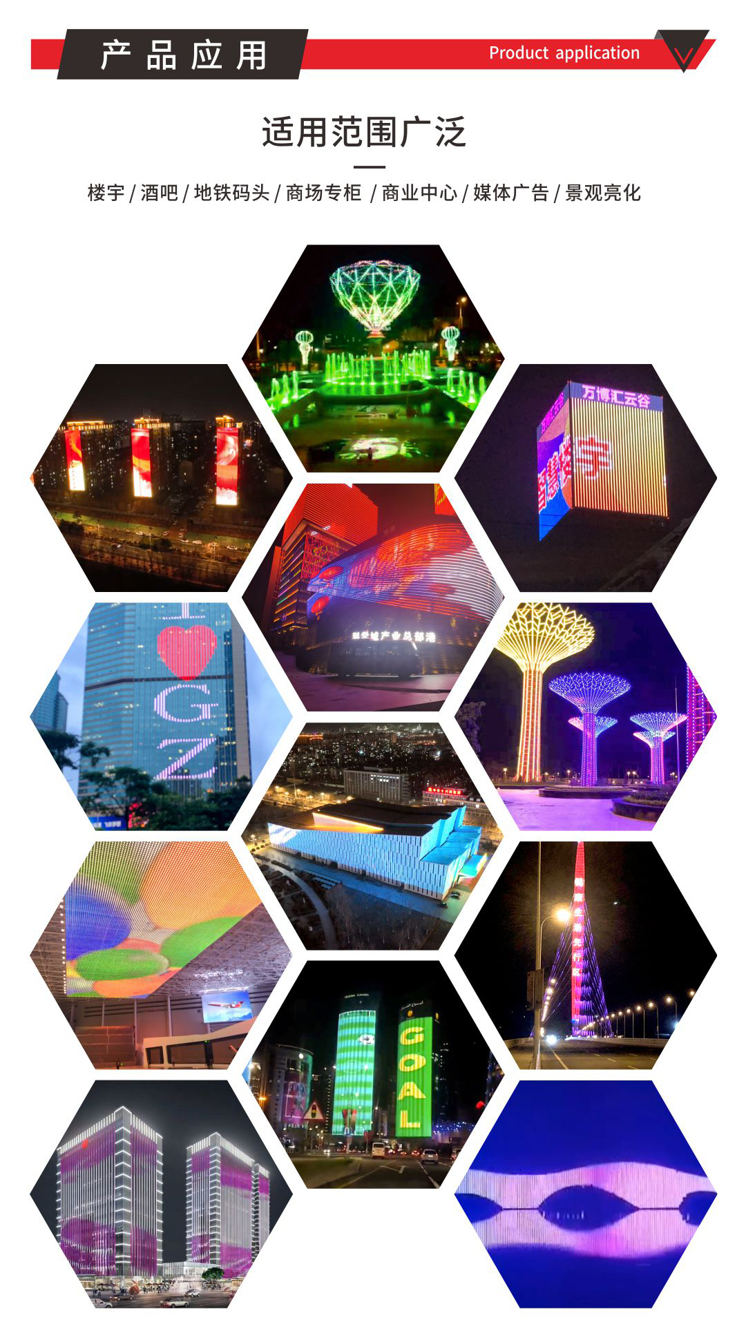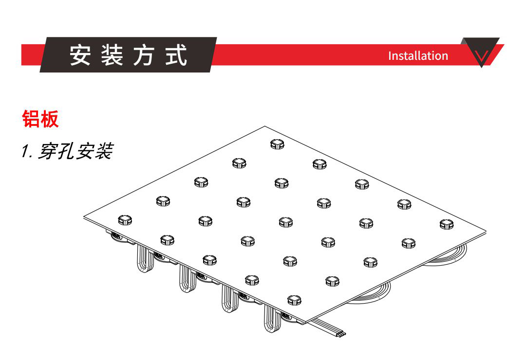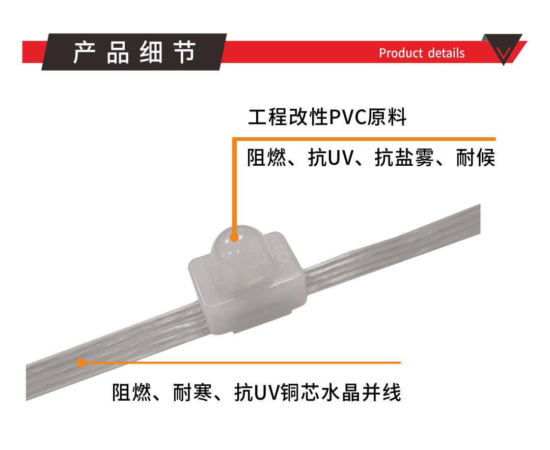 產品特點: 1.采用加大線徑點光源,支持更遠距離的供電和信號傳輸方式。 2.安裝方式靈活:產品尺寸小,重量輕,配合軟性鋼絲繩,可以實現(xiàn)靈活多樣的安裝方式。 3.具備壞點續(xù)傳功能,即使其中一個像素點損壞不會影響后續(xù)像素點的信號接收,最大程度降低產品故障率。 4.多種間距選擇,靈活控制項目成本 安裝配件鋼絲卡條安裝方式:1.裝鋼絲卡條做網屏 2.穿孔安裝